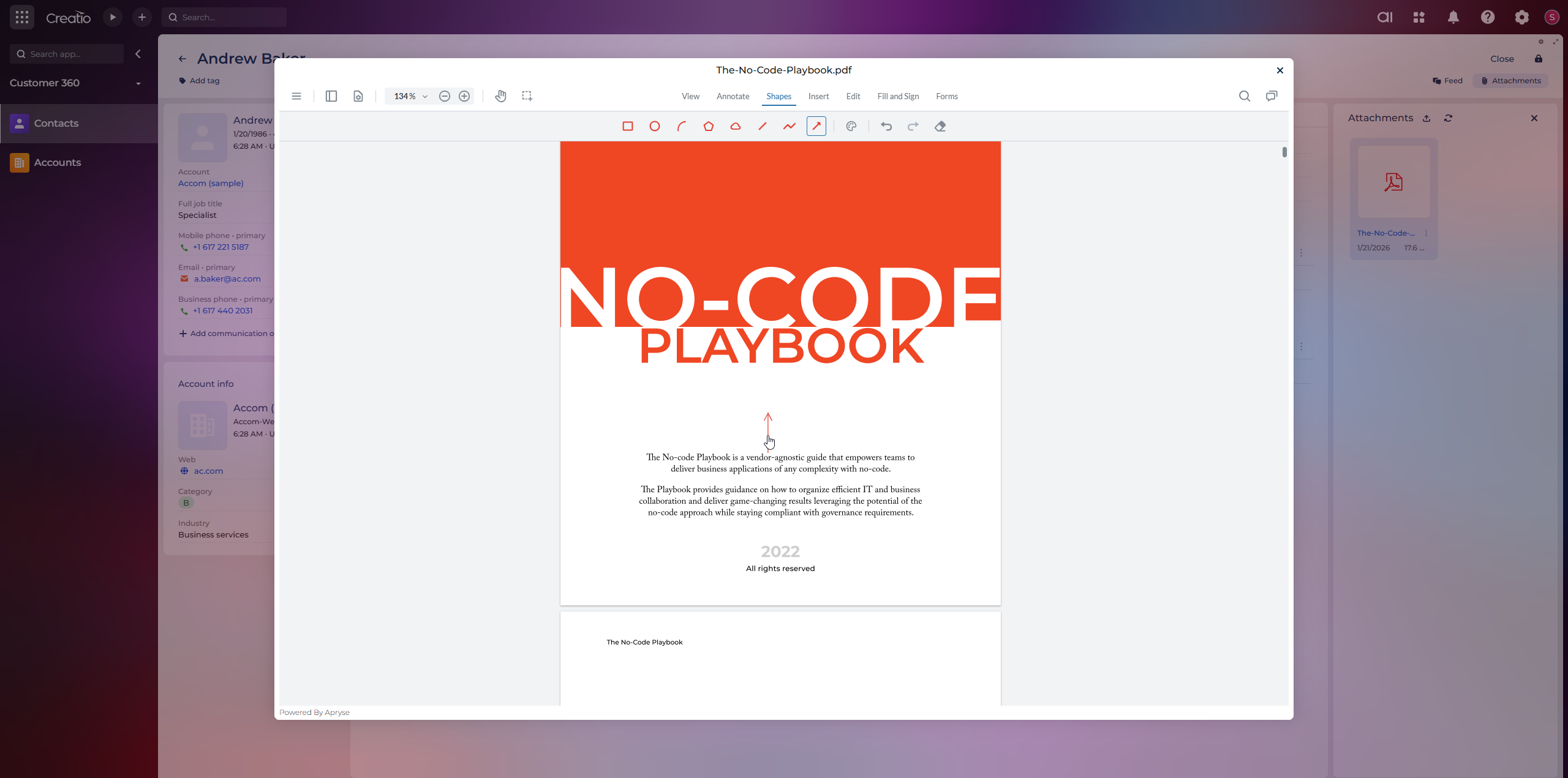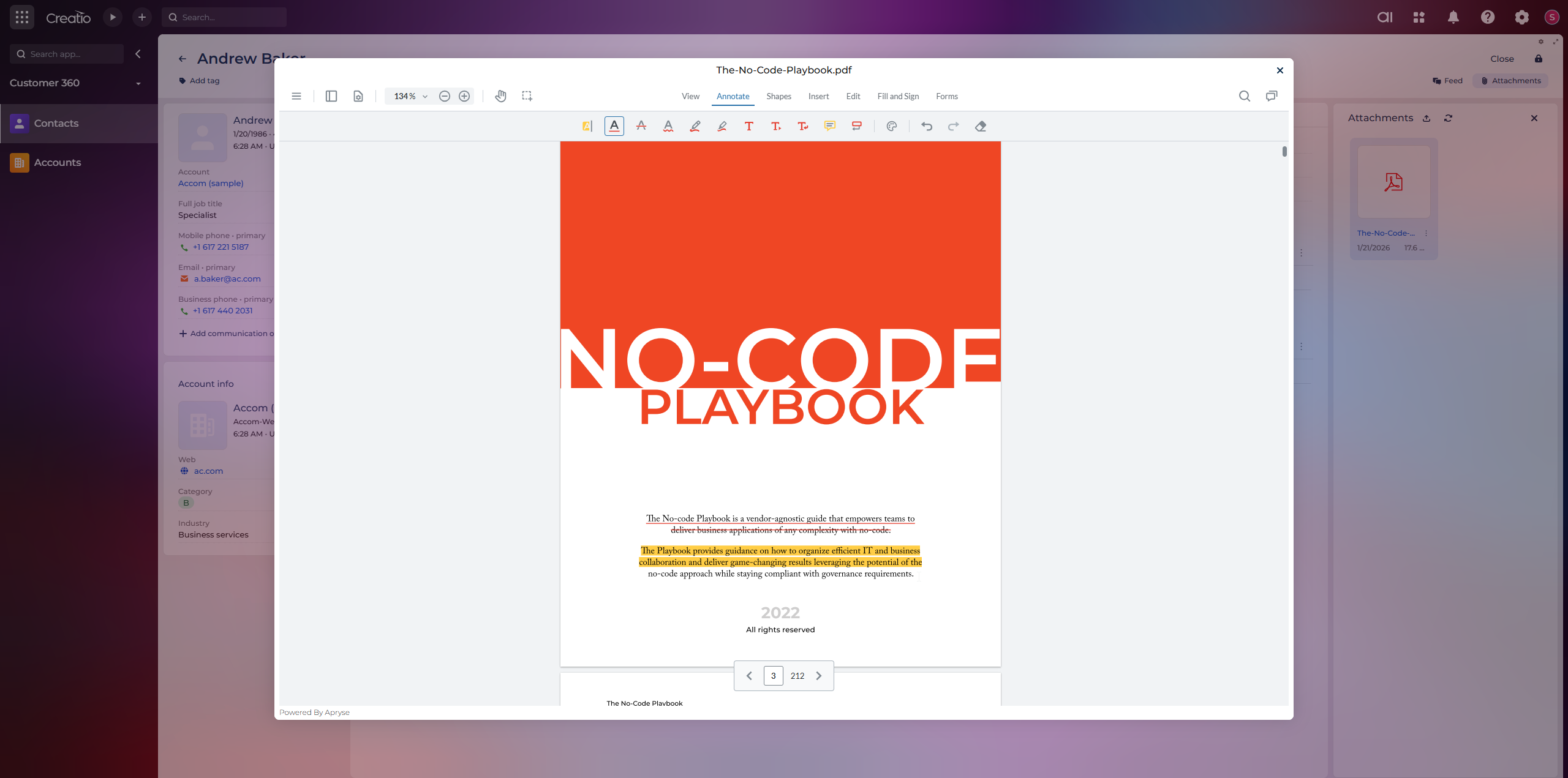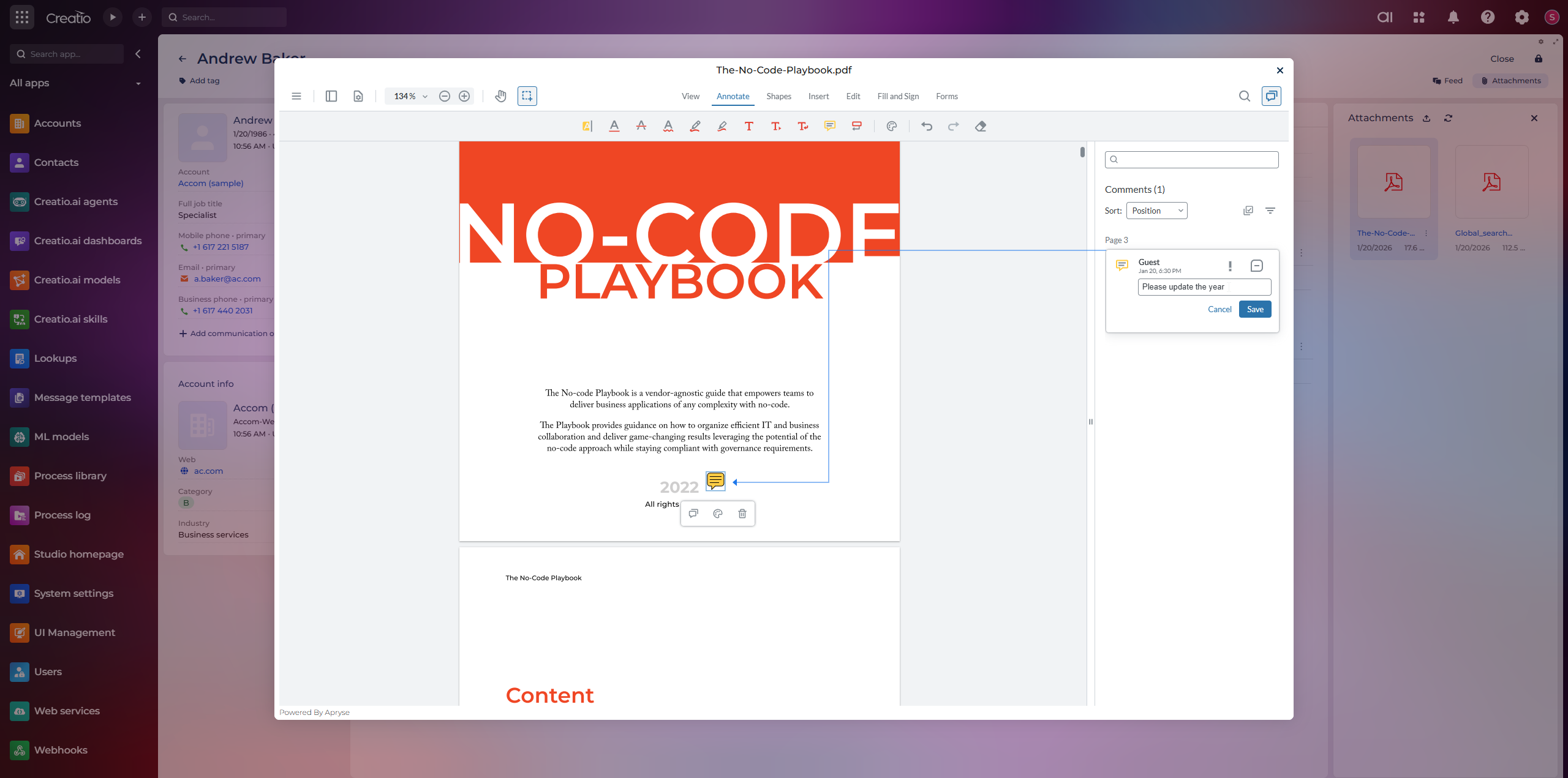 Apryse Annotations adds document annotation capabilities to Creatio records. The app extends the File preview window, allowing users to add comments, highlights, drawings, and other markups to files directly in Creatio.