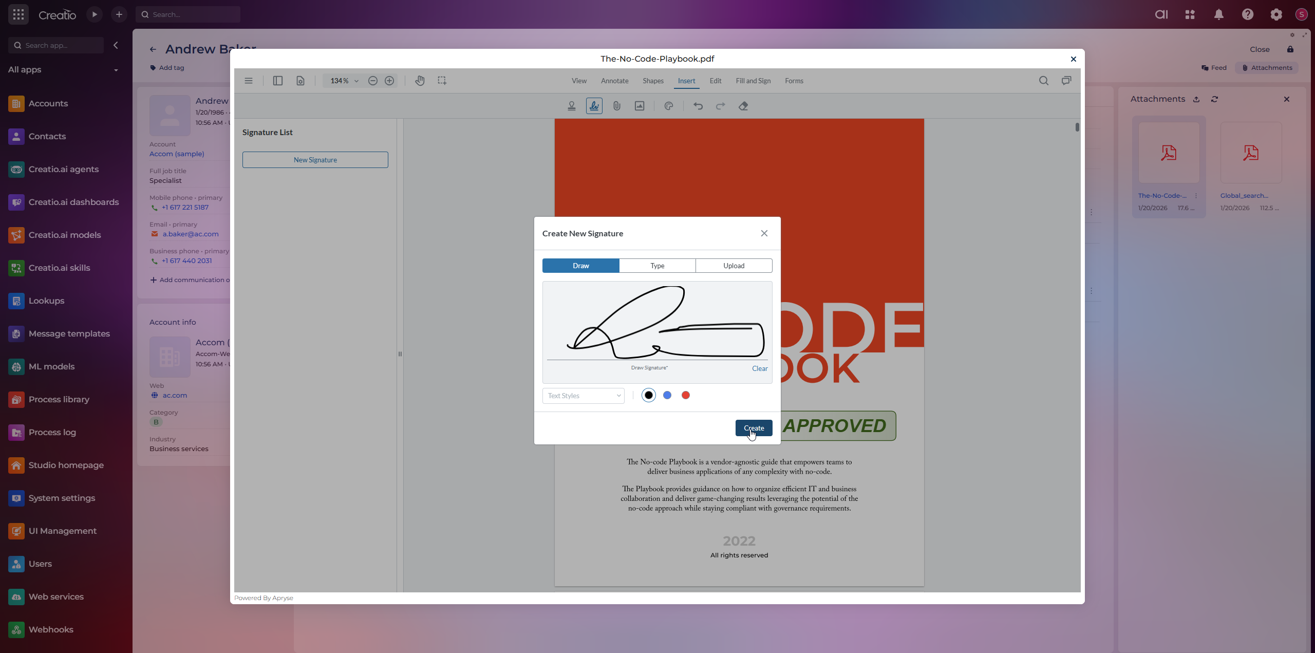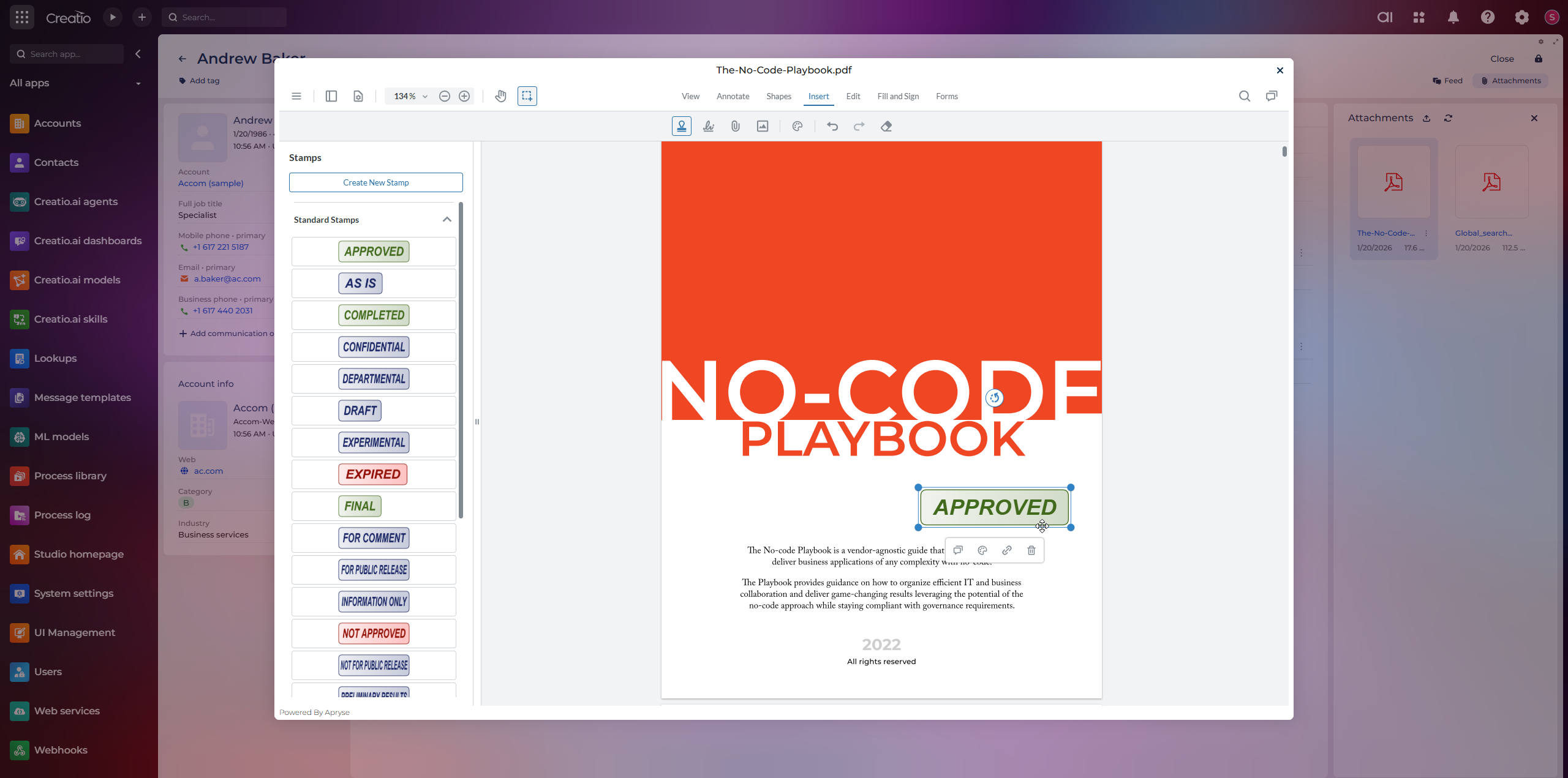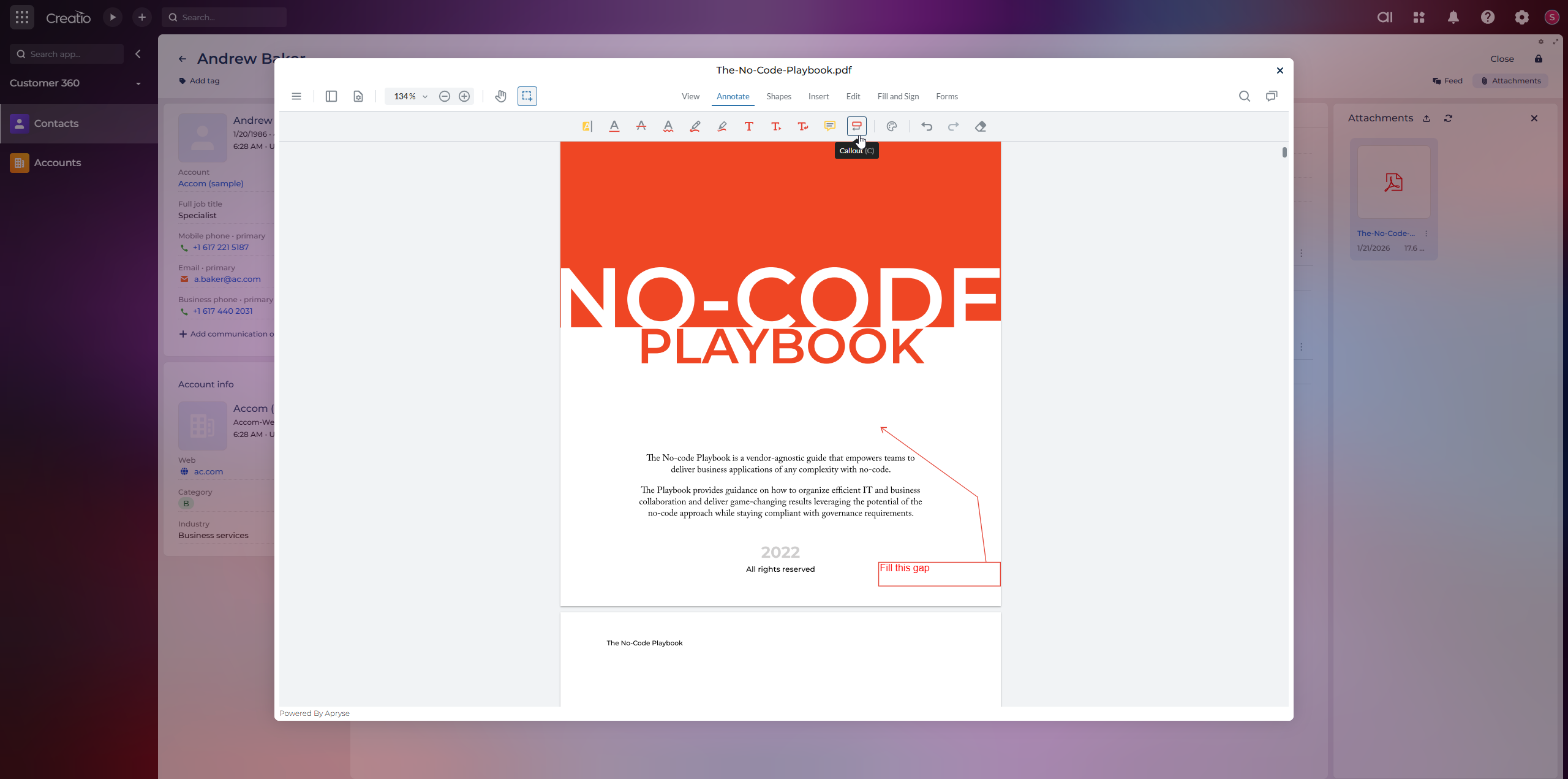Apryse Annotations adds document annotation capabilities to Creatio records. The app extends the File preview window, allowing users to add comments, highlights, drawings, and other markups to files directly in Creatio.