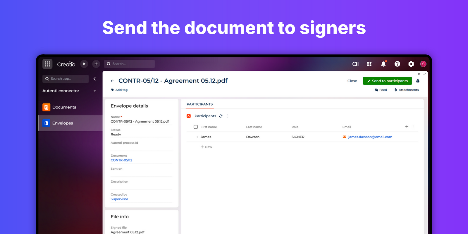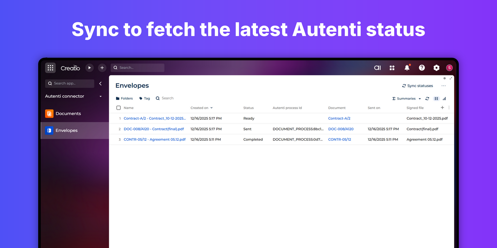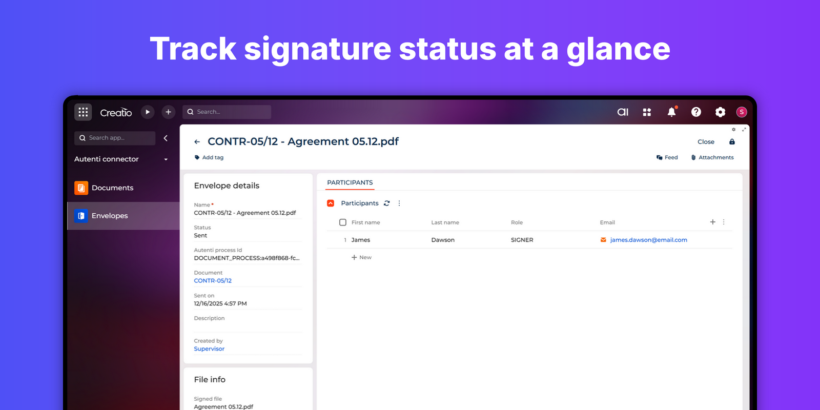 Send documents from Creatio to Autenti, trigger e-signature for participants, and track status - without leaving Creatio.