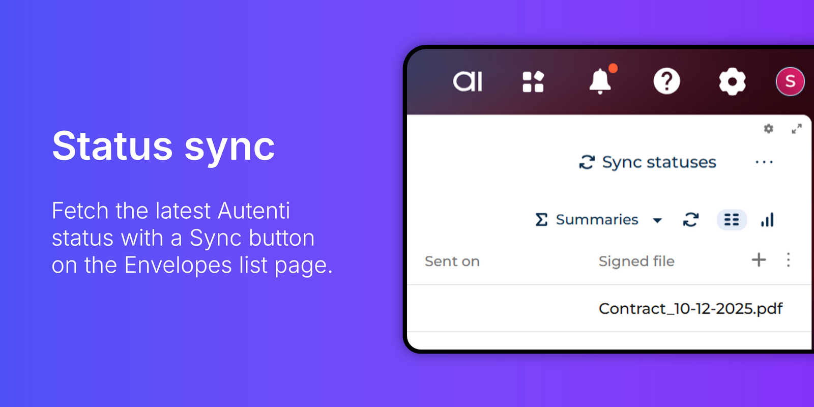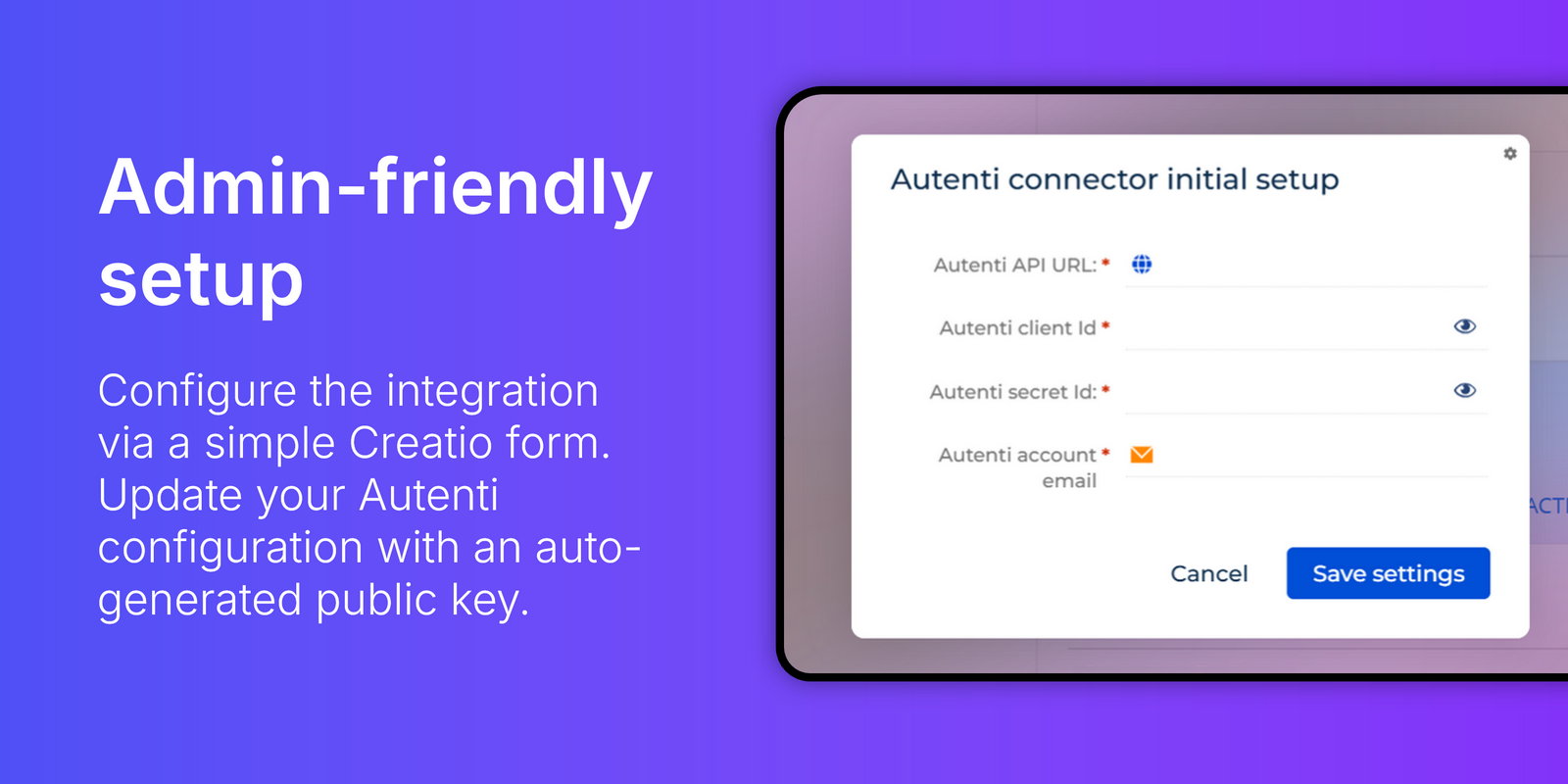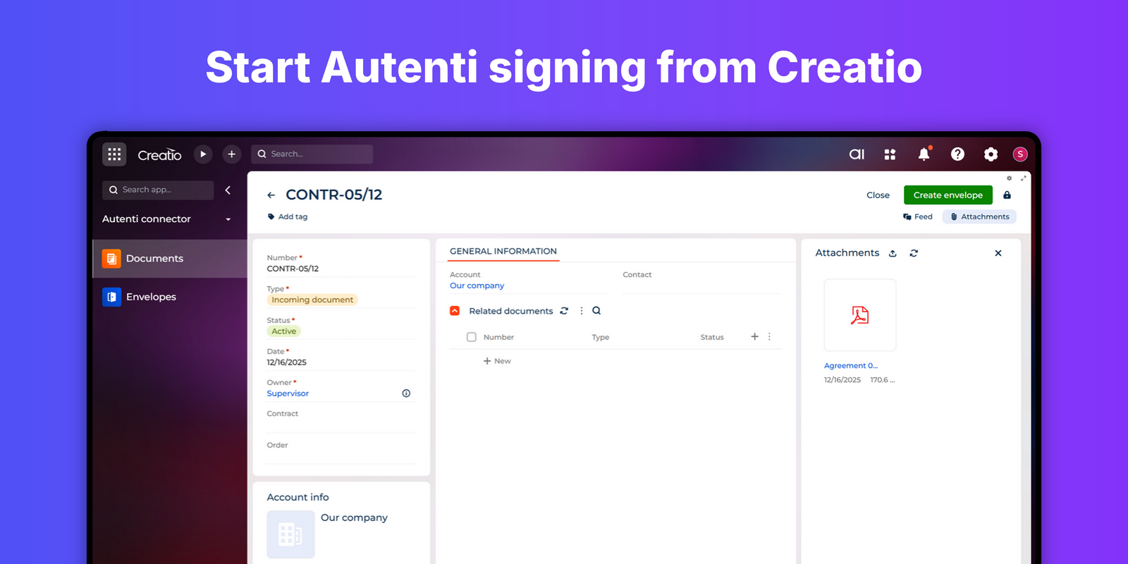 Send documents from Creatio to Autenti, trigger e-signature for participants, and track status - without leaving Creatio.