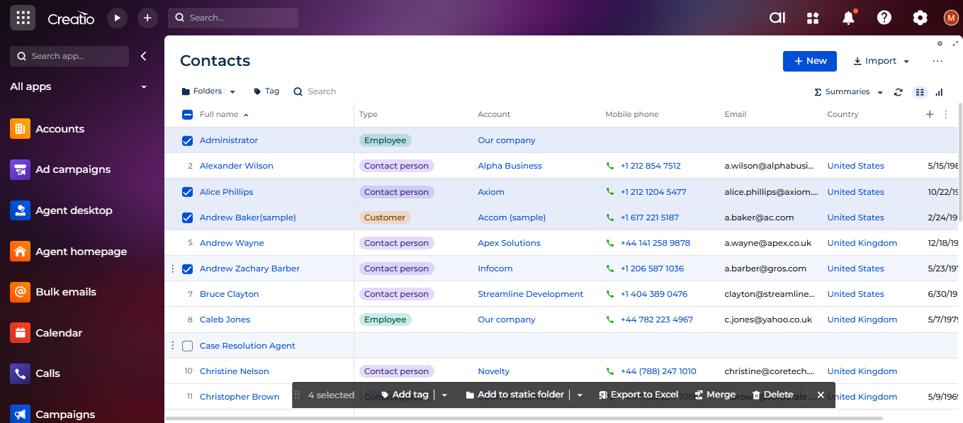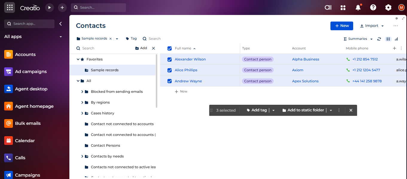 The application works seamlessly with both out-of-the-box (OOTB) Creatio sections and custom sections, making it suitable for standard as well as extended data models.