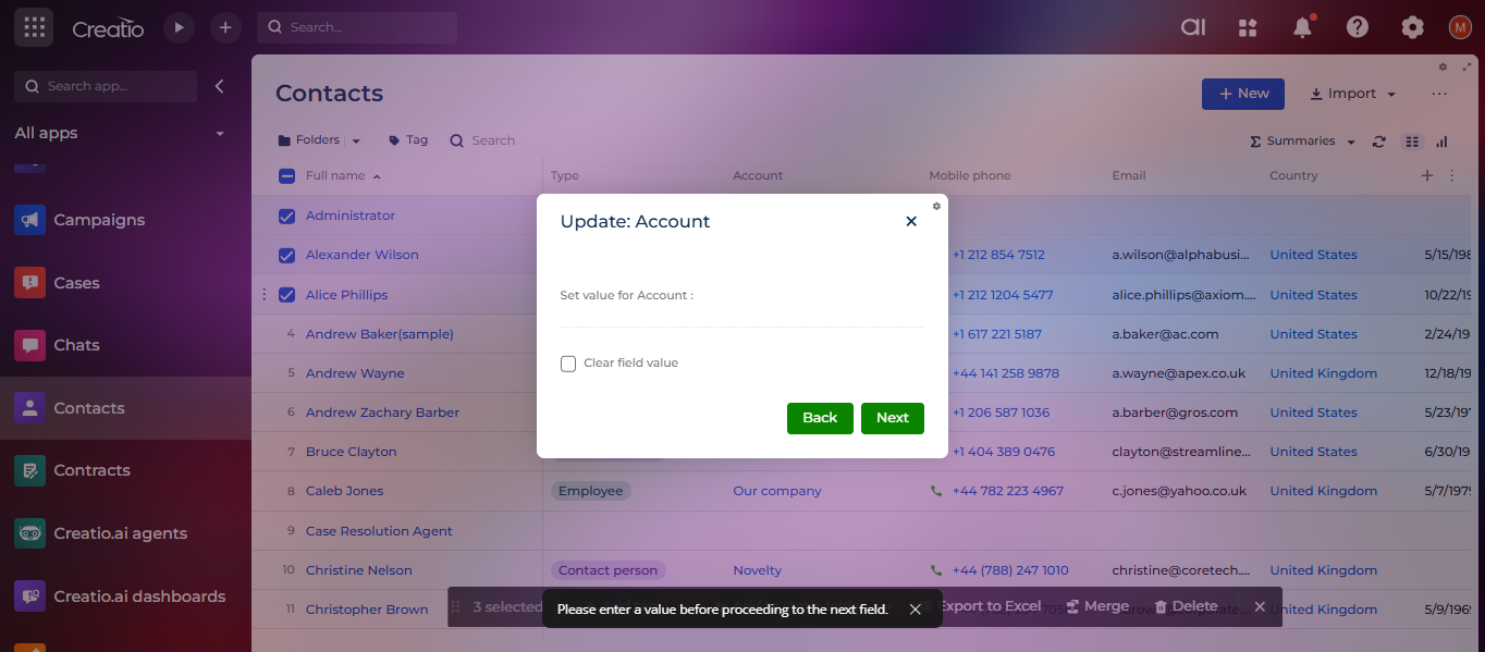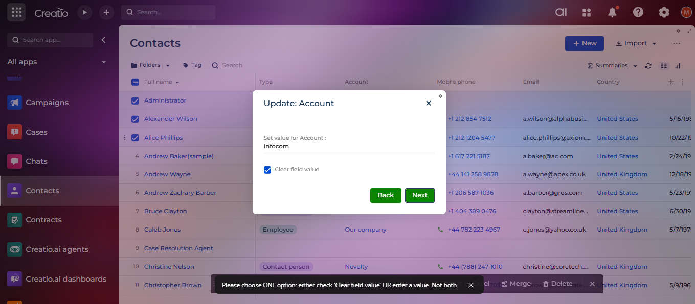 • Follow the guided wizard to choose fields, set new values or clear values, and confirm the update.After confirmation, the selected records will be updated in bulk with validation and optional audit tracking.