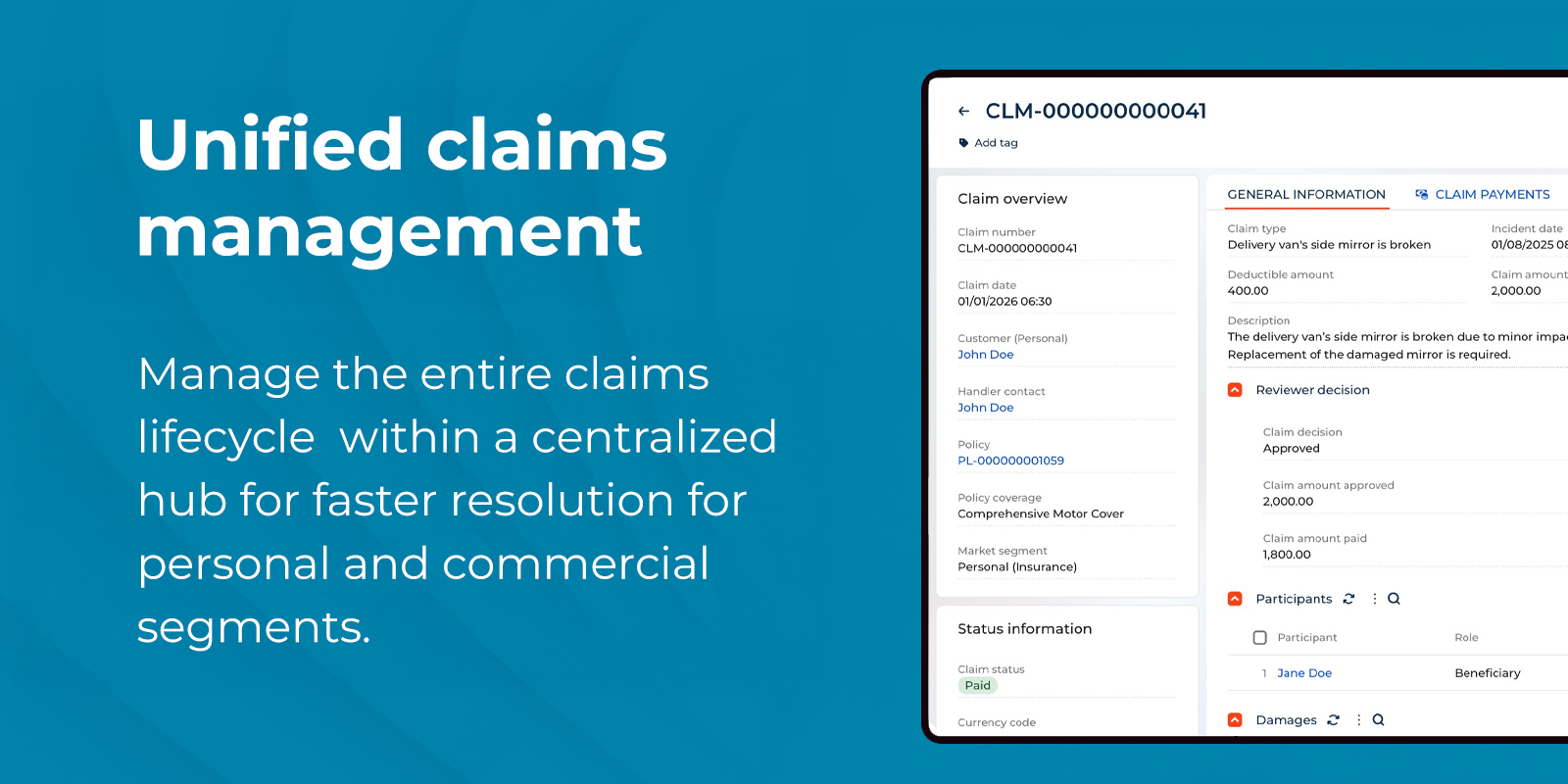 Streamline your insurance operations with our application. This solution manages end-to-end claims journeys, from claim intake to payments for personal and commercial market segments. Automate workflows for faster processing and a superior customer experience. You can also use our Underwriting Management for Creatio application (from marketplace) if you intend to manage both policies and claims together