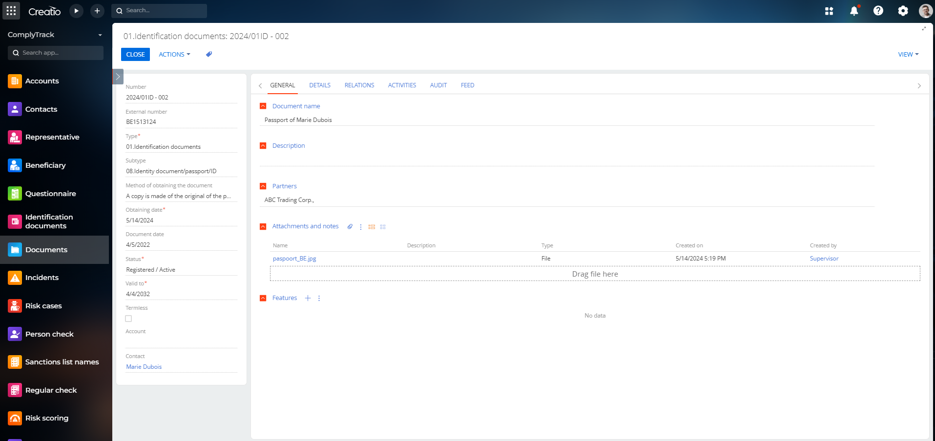 ComplyTrack for Creatio provides a unique set of functions and electronic processes every organization needs in order to combat money laundering and terrorism financing. The close relation of this app with other Creatio objects (processes, persons, documents) makes the process of compliance incident processing highly automated, provides any investigation with the full set of the necessary information, and ensures control over the execution of the decisions aimed at minimizing compliance risks. The app can be used for automation of compliance with other requirements of the regulator (legislation, industry standards). The universal functionality of the app makes it a convenient tool in the internal control system of any company.