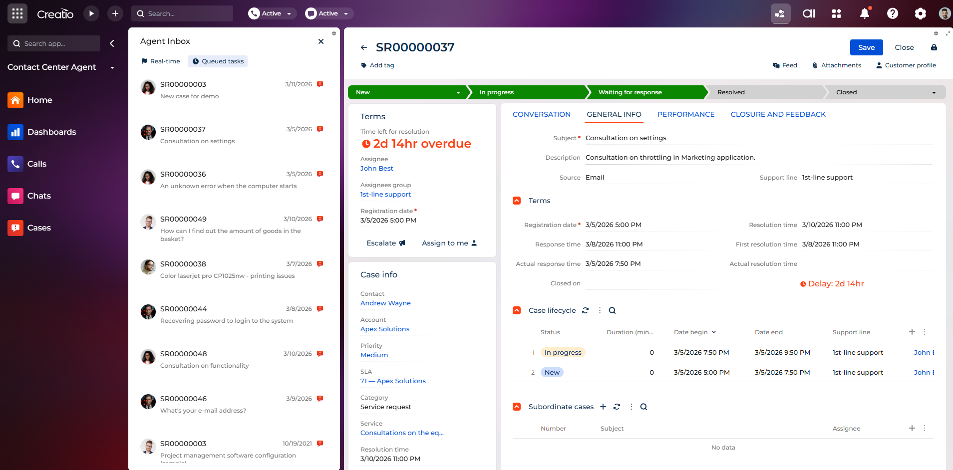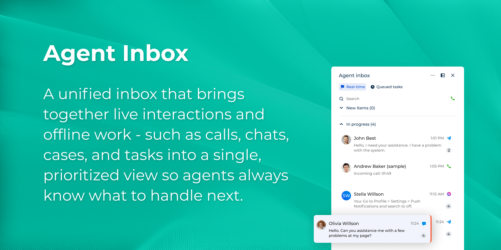 Handle customer calls, chats, and service requests from a unified agent inbox that prioritizes live and offline work.