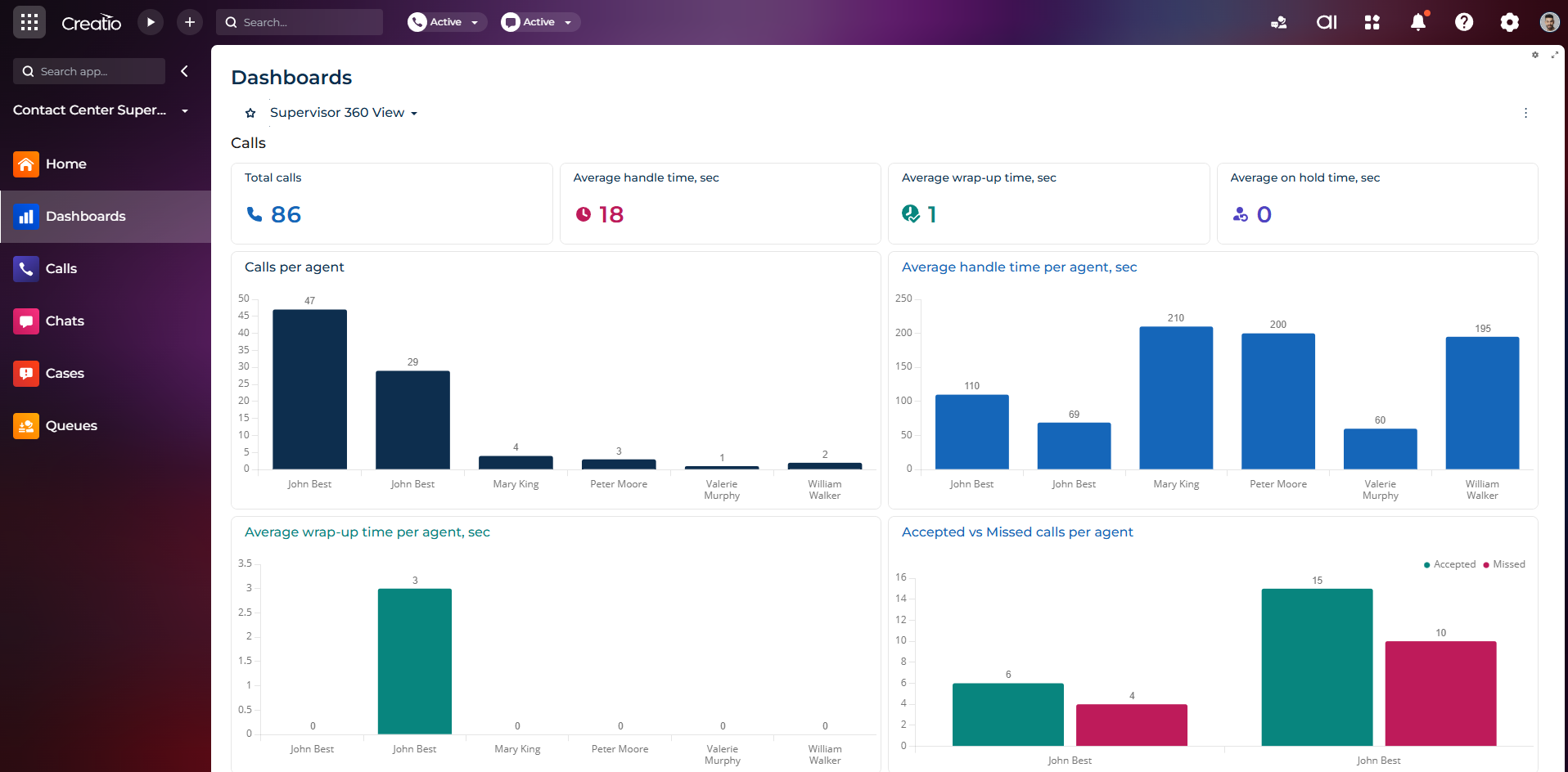 Track team activity, queue performance, and operational metrics in real time to support proactive supervision.