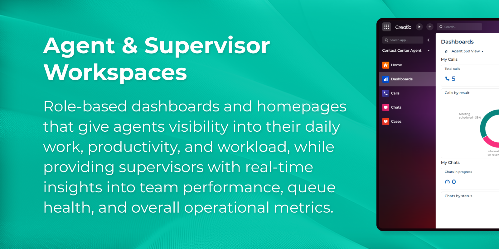 Monitor agent productivity, workloads, and key performance indicators through role-based dashboards and workspaces.