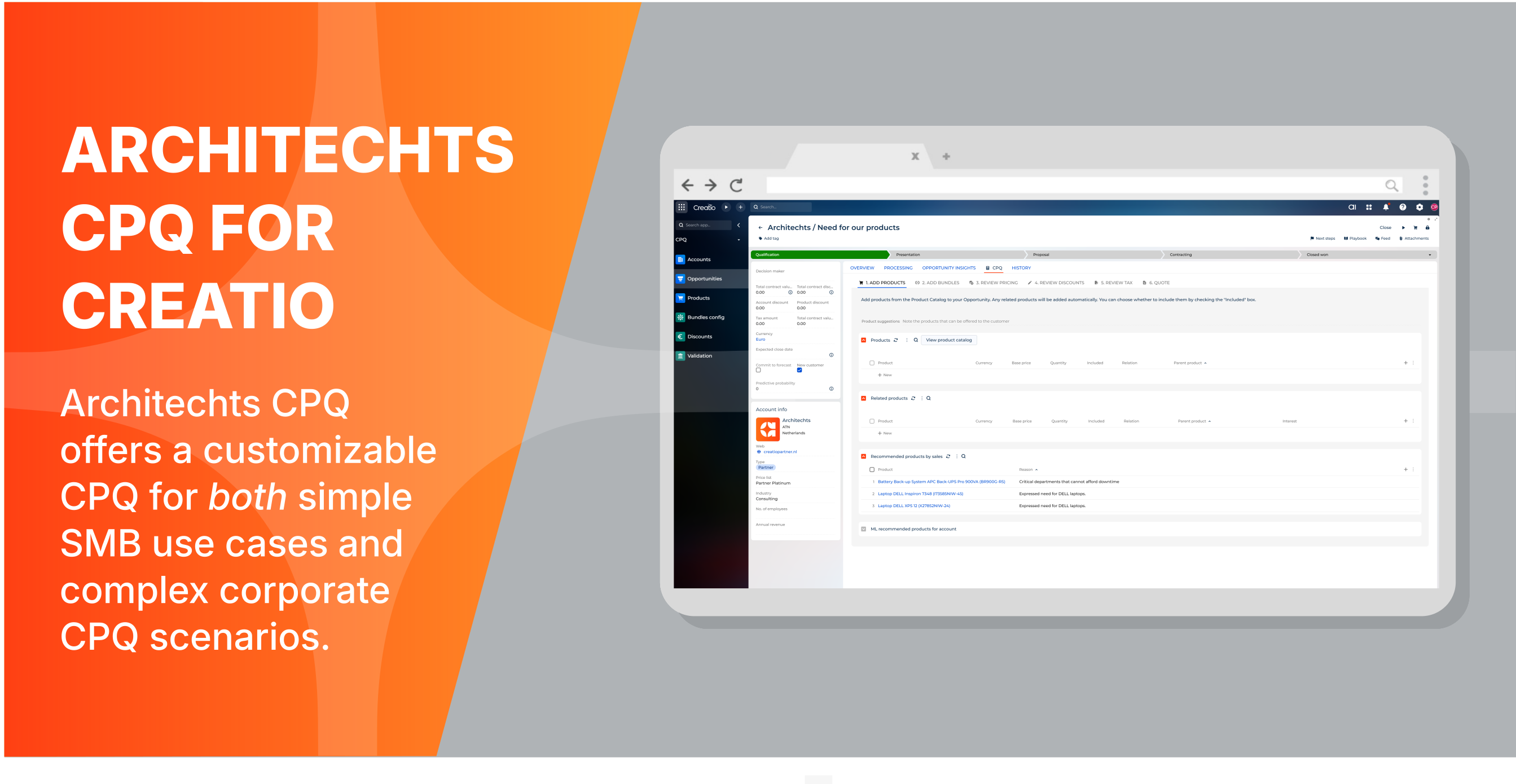 CPQ (Configure, Price, Quote) integrates with Creatio CRM to streamline sales processes, ensuring accurate pricing/quotes, and personalized solutions.
