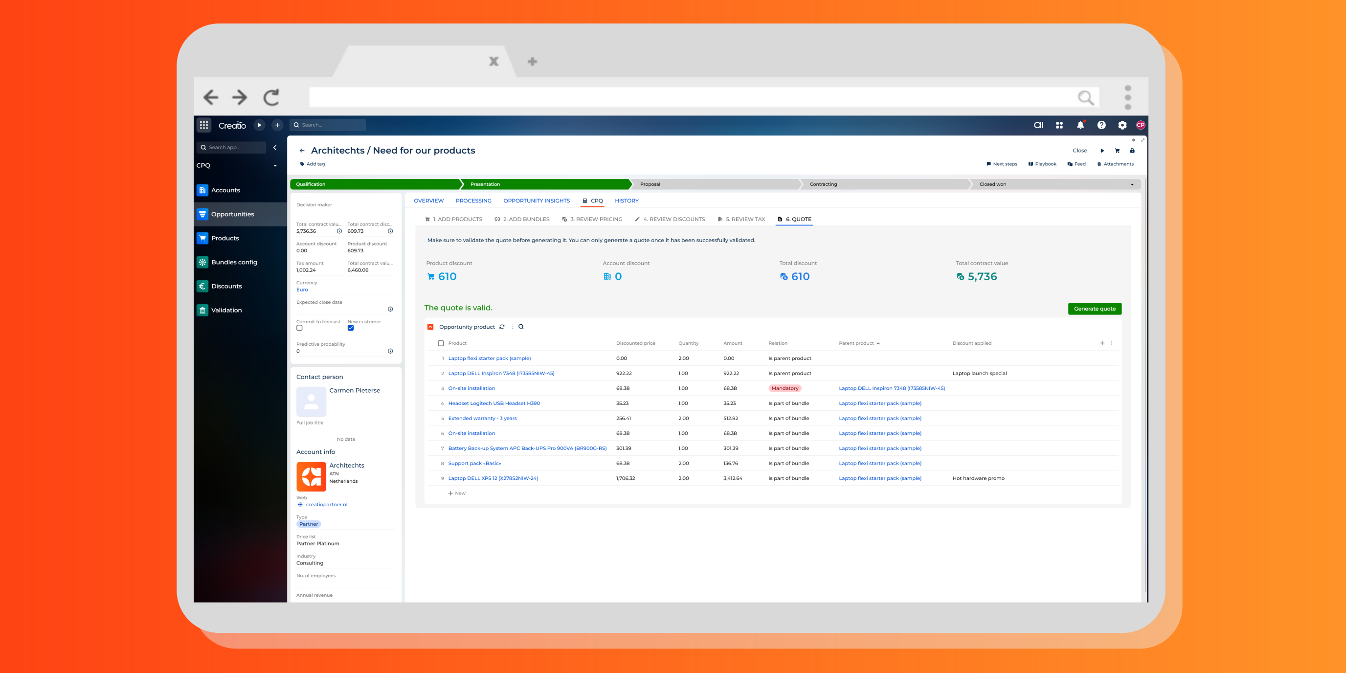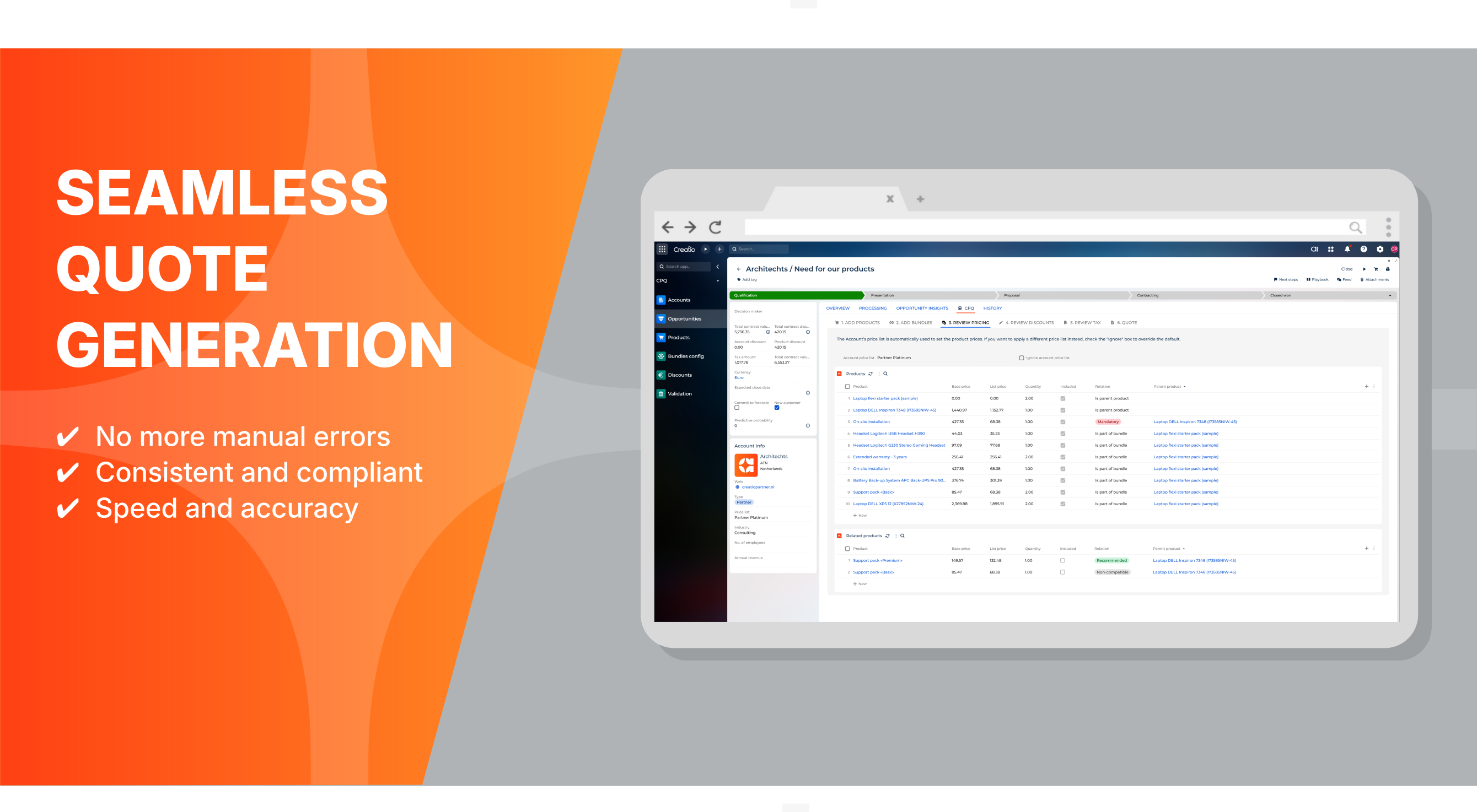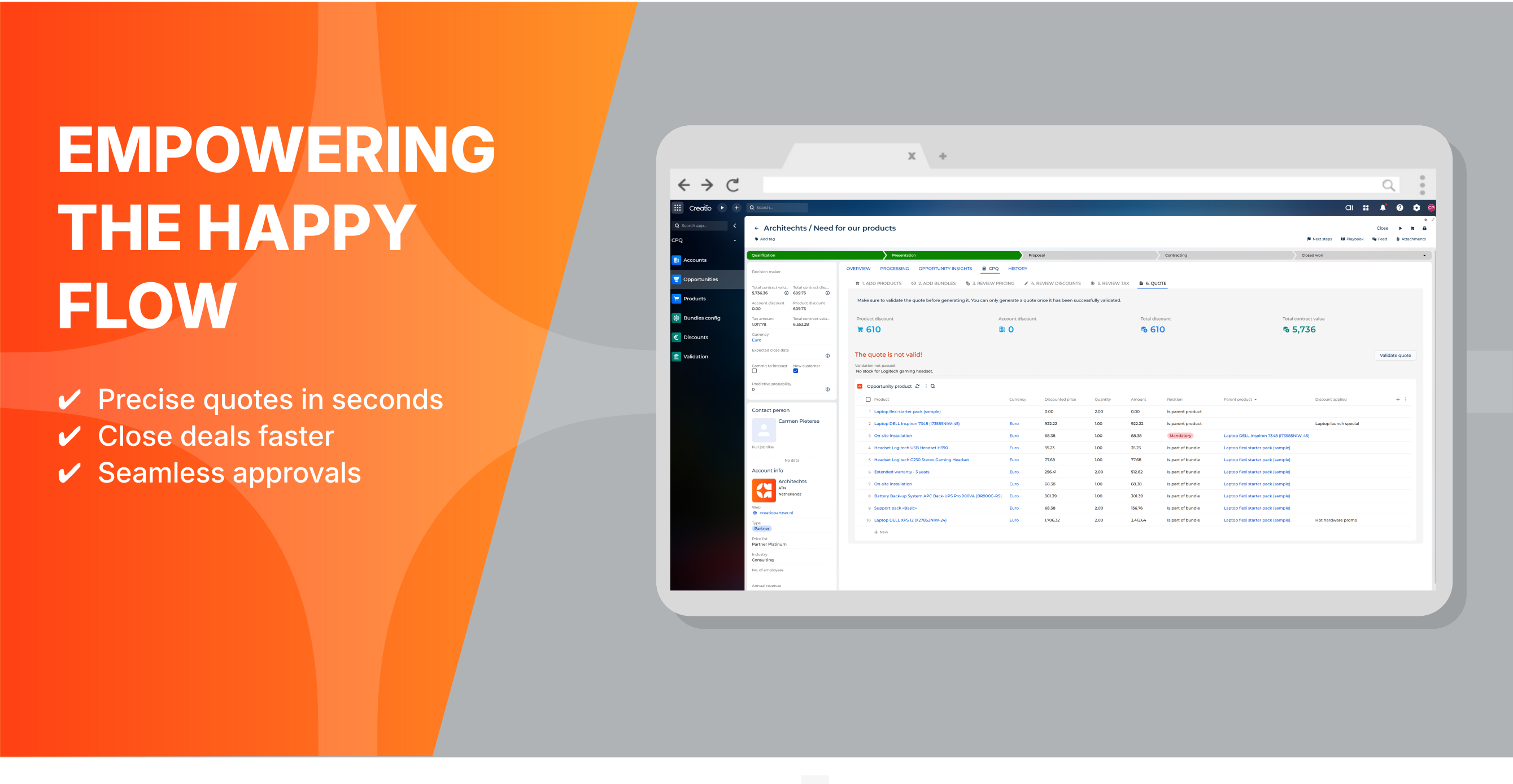 CPQ is an advanced sales tool that automates and guides you through the quoting process, empowering your sales team to easily assemble complex and accurate quotes while ensuring consistency with pricing strategies.