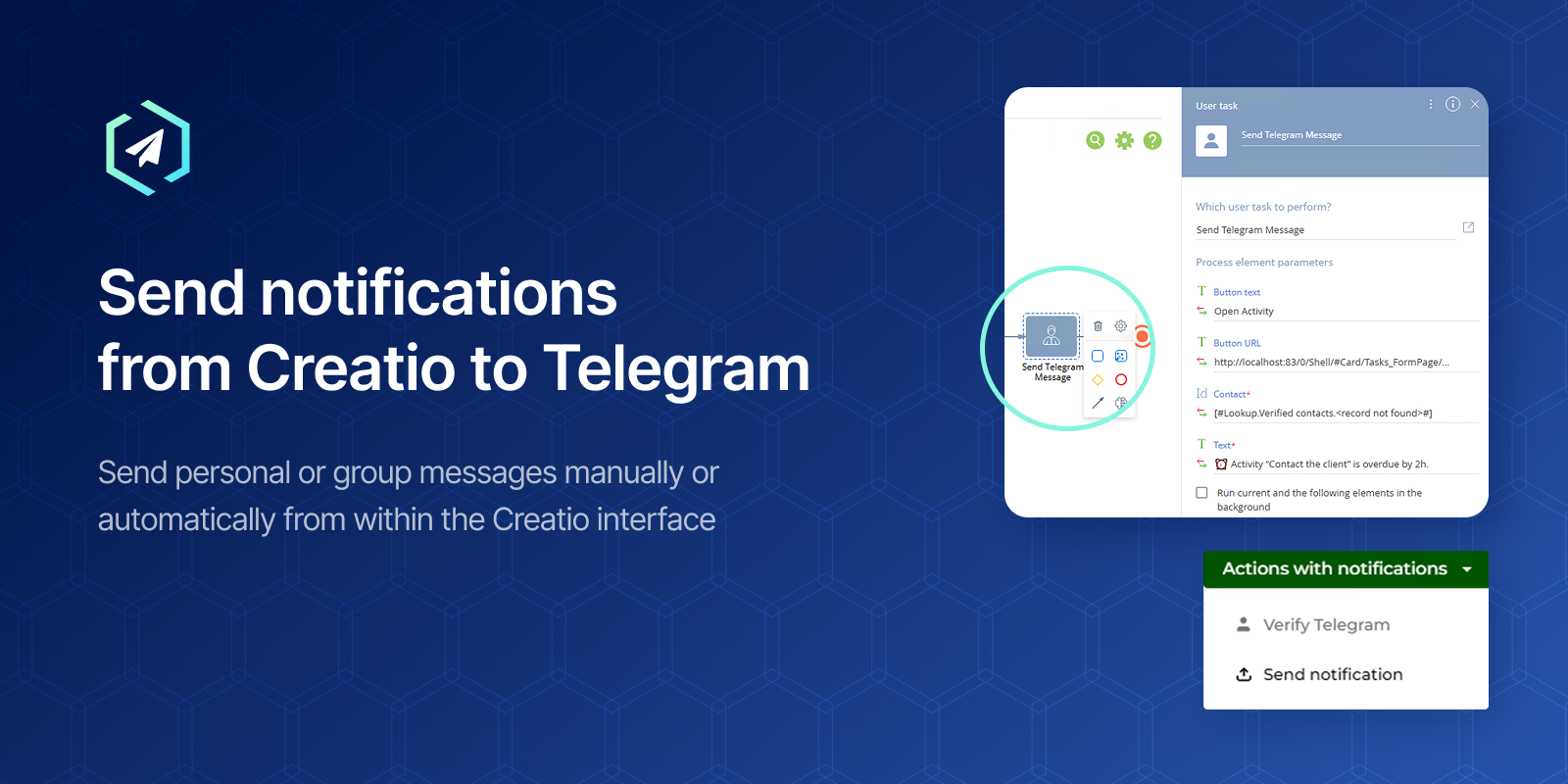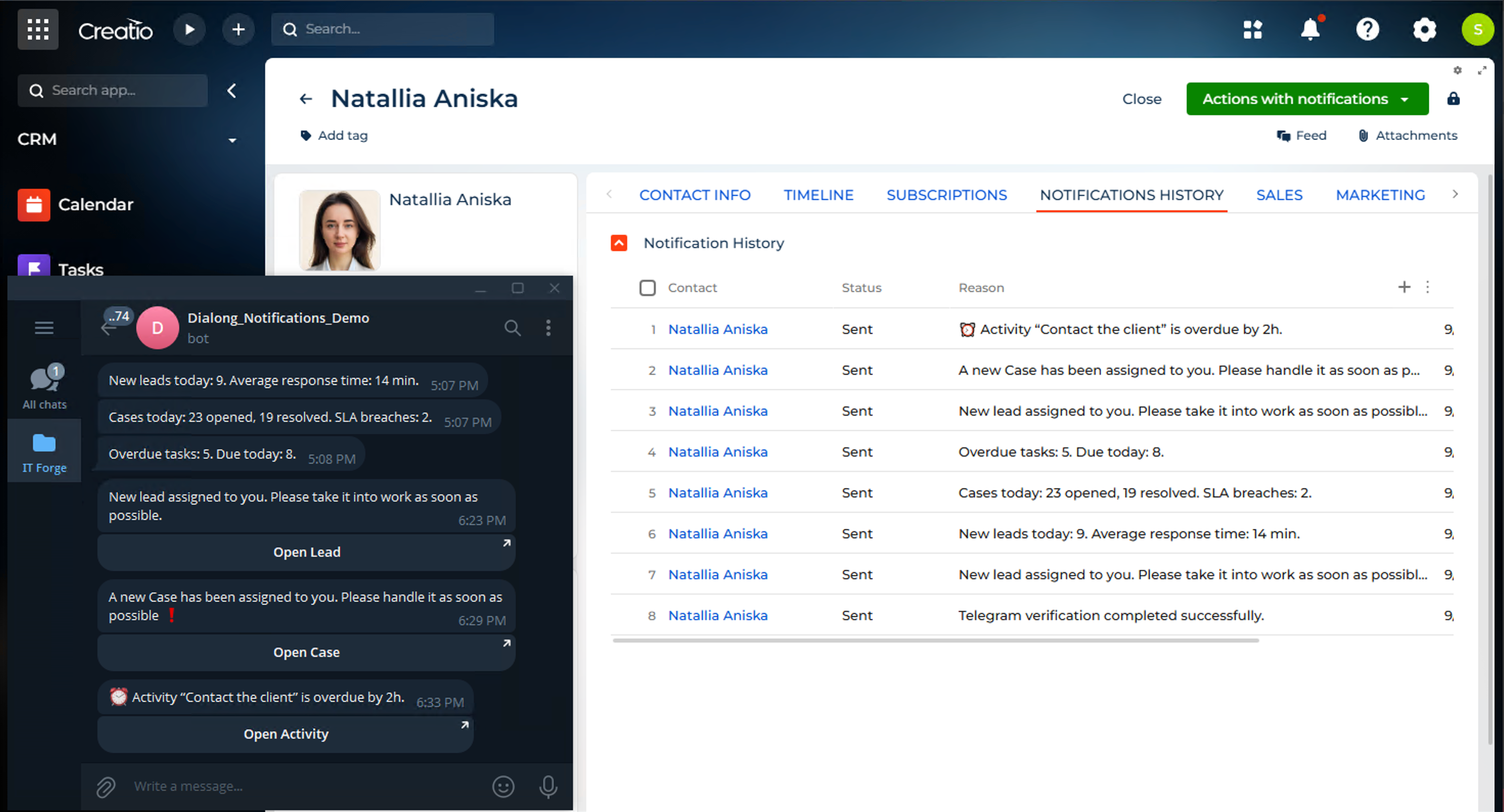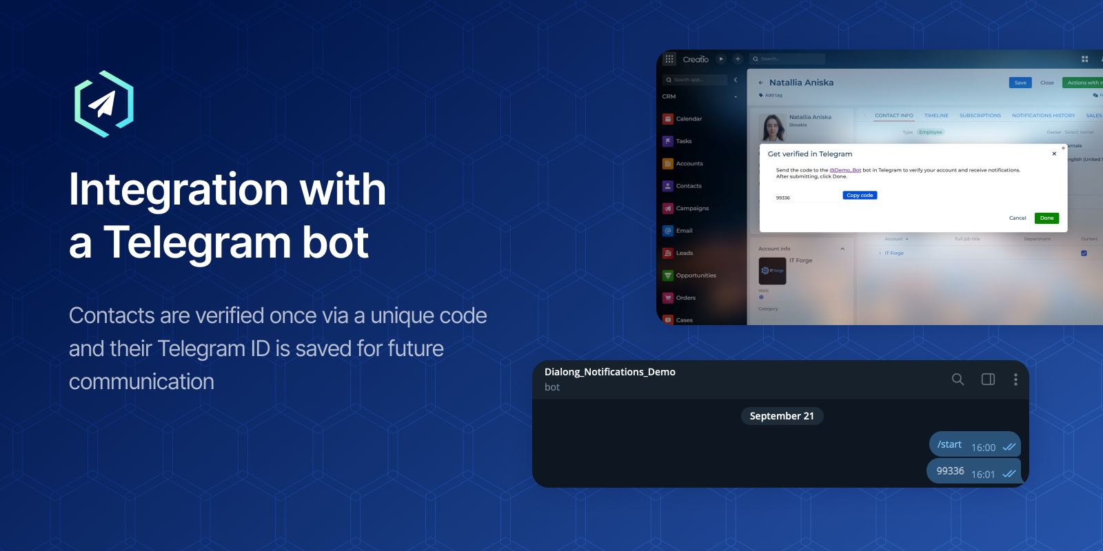 Dialong Notifications extends Creatio by integrating with the Telegram messenger to deliver event-based notifications. Messaging is carried out through your Telegram bot and only with verified contacts, ensuring secure and reliable communication. The add-on helps organizations keep employees and customers informed in real time, improving transparency, engagement, and responsiveness.