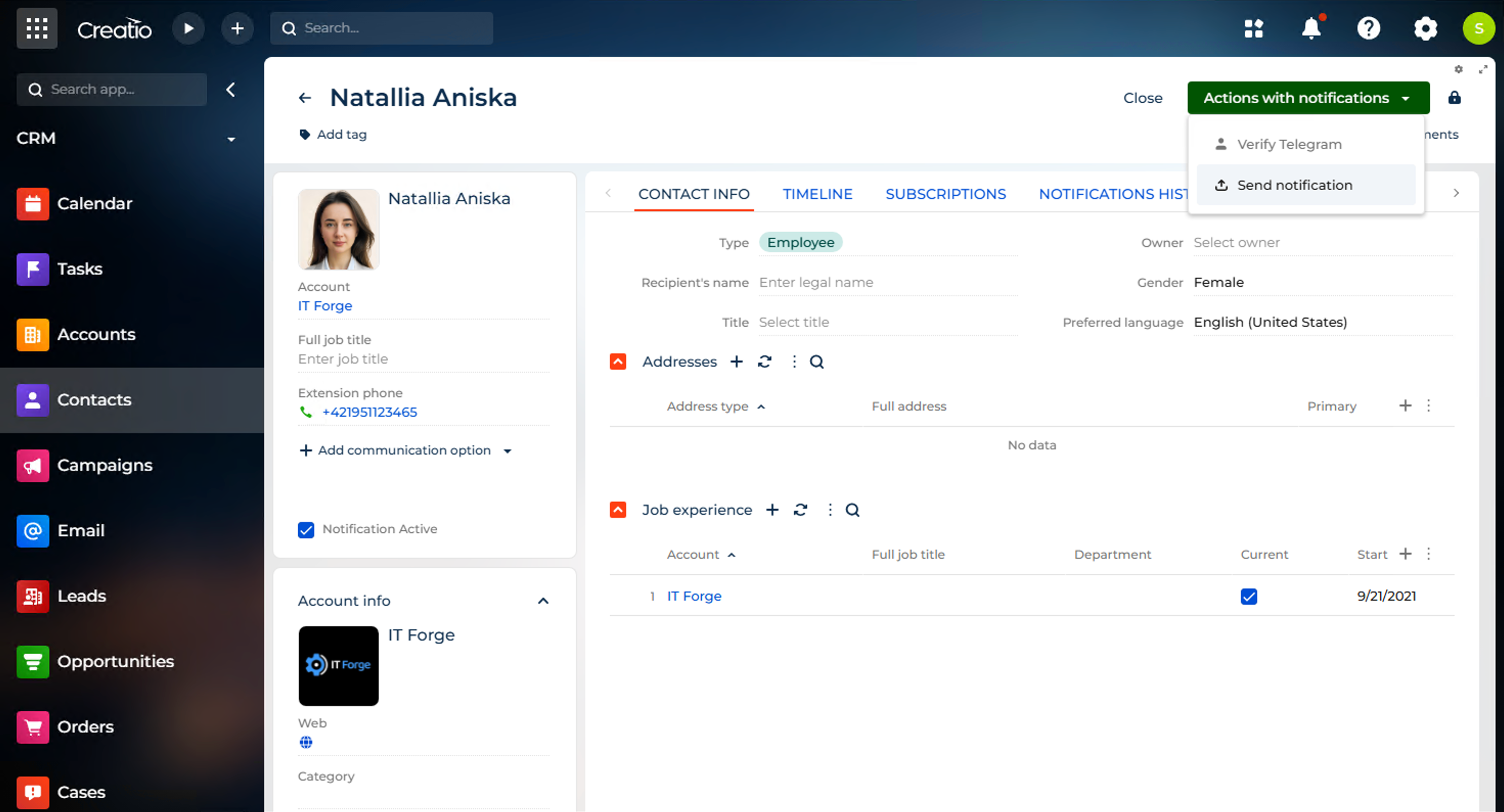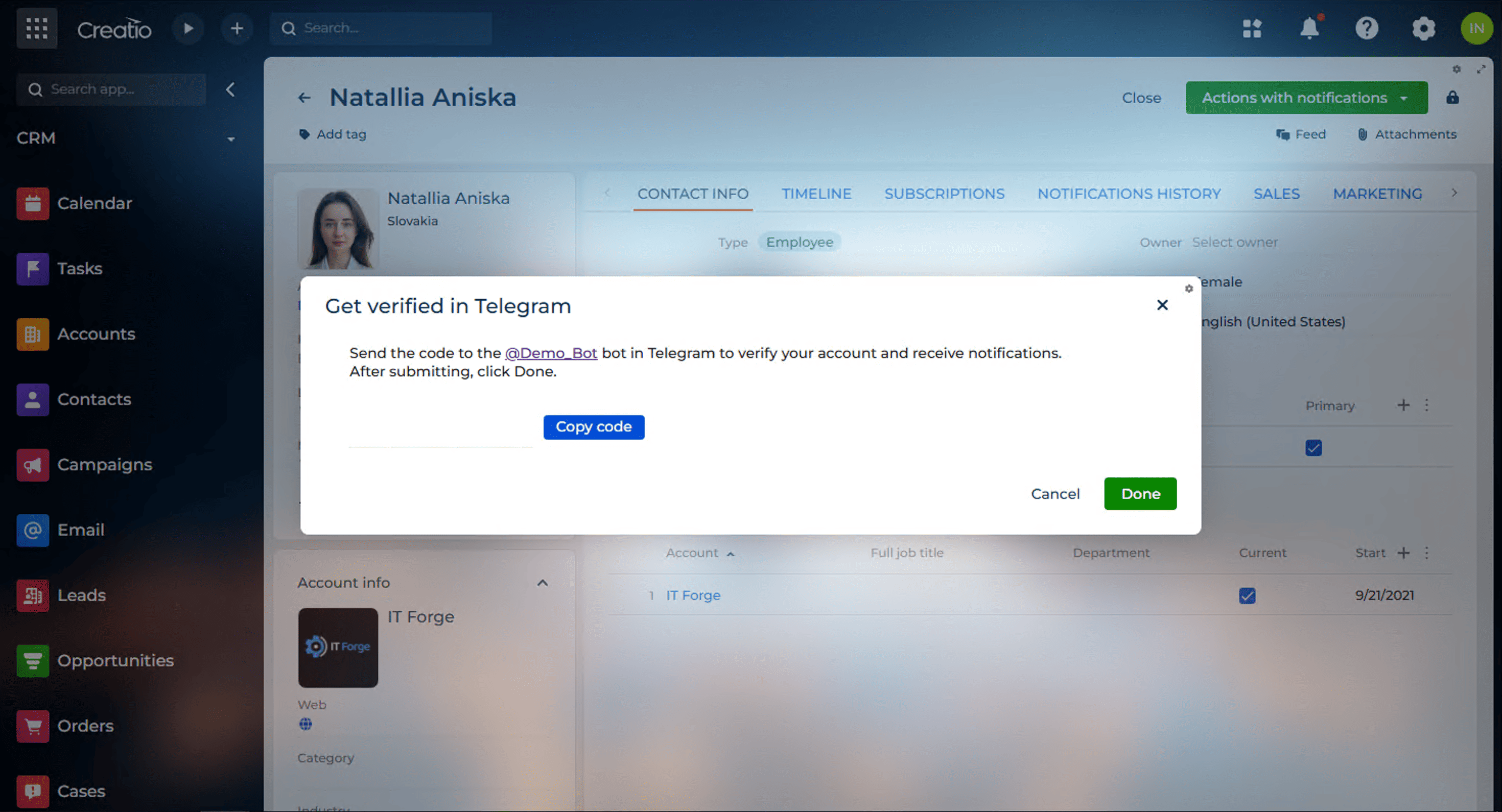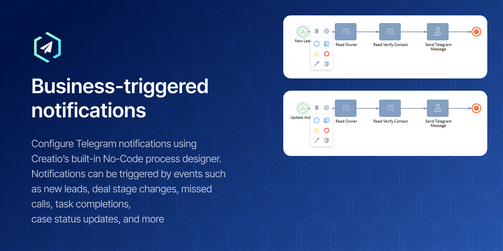 Dialong Notifications extends Creatio by integrating with the Telegram messenger to deliver event-based notifications. Messaging is carried out through your Telegram bot and only with verified contacts, ensuring secure and reliable communication. The add-on helps organizations keep employees and customers informed in real time, improving transparency, engagement, and responsiveness.
