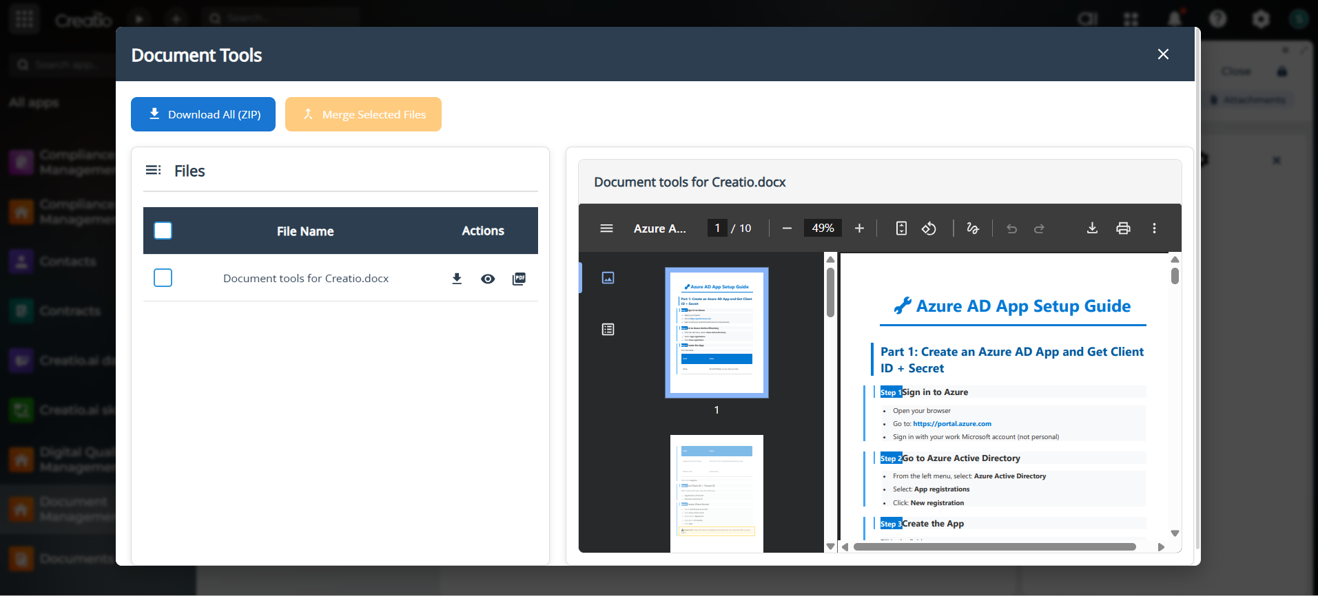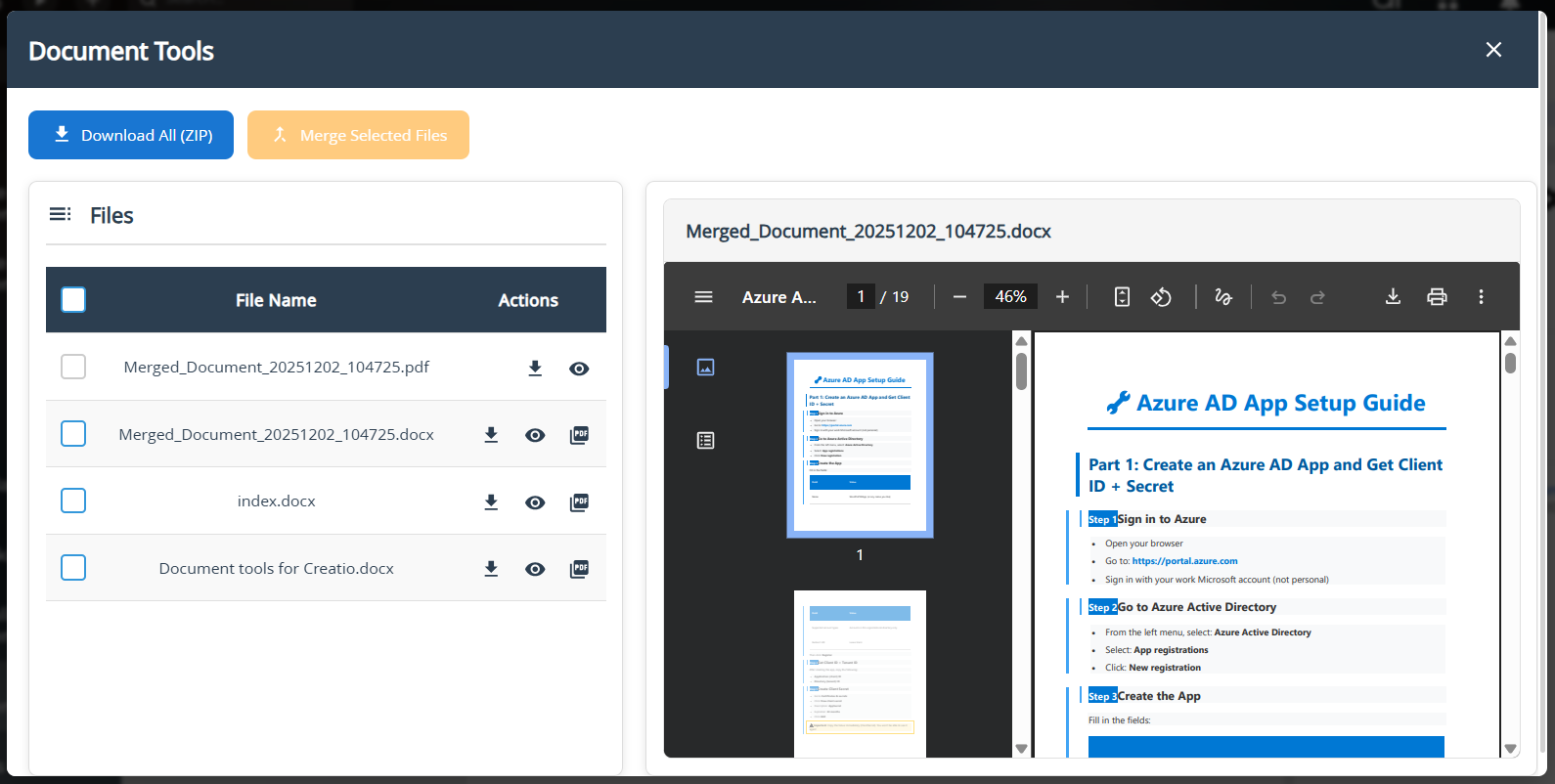 Creatio component integrated with Office 365 OneDrive that displays record attachments, offers an embedded document viewer, enables ZIP downloads, converts Word files to PDF, and merges Word documents using Microsoft Graph.