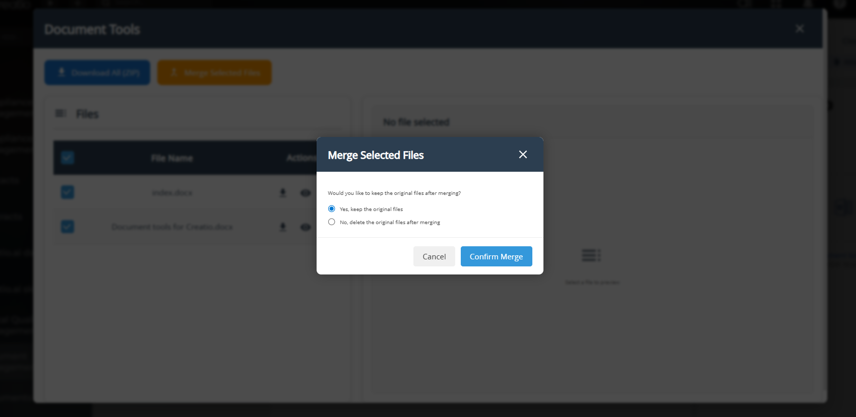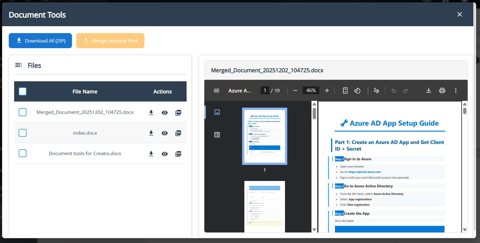This component provides users with a unified and intuitive interface for managing attachments related to any Creatio record. Leveraging Microsoft’s document processing capabilities, it offers built-in file viewing, conversion, and merging tools - eliminating the need for external applications and improving productivity across business processes.