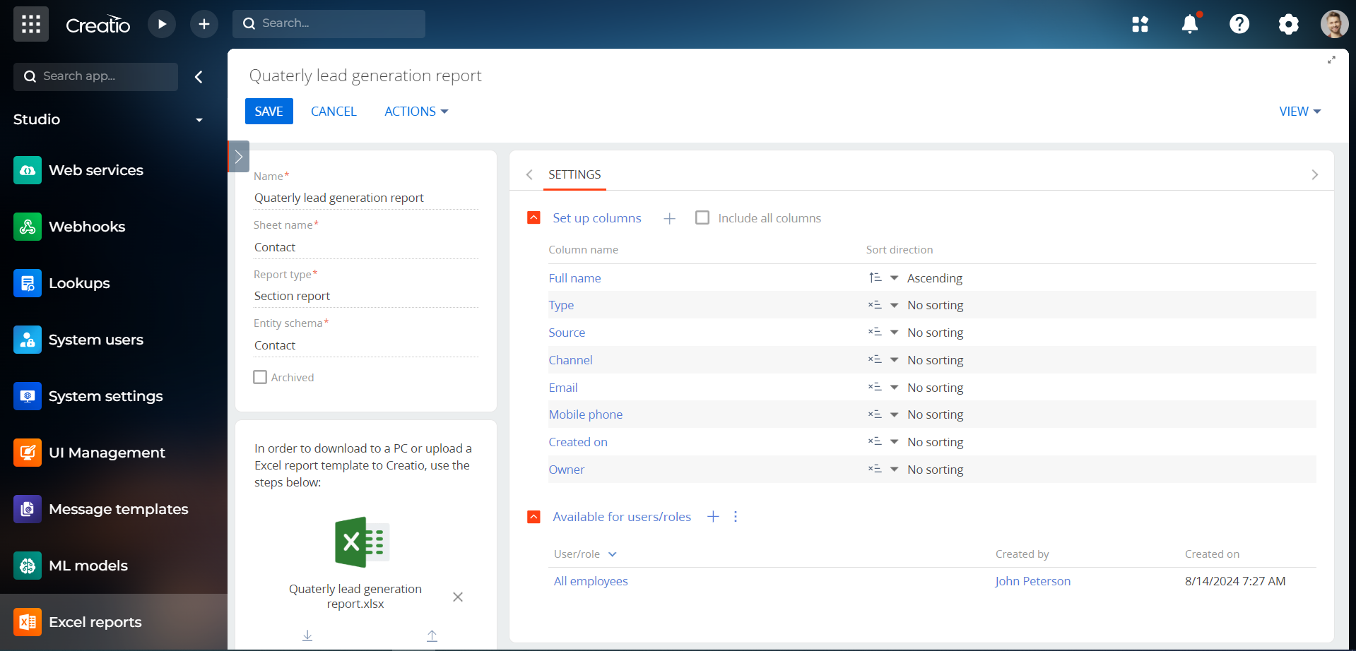 3. Create report. Go to "Excel report" section, select "New report". Enter report name, report type and select the Creatio object that contains data for export (for more report setting details please use a Setup guide).