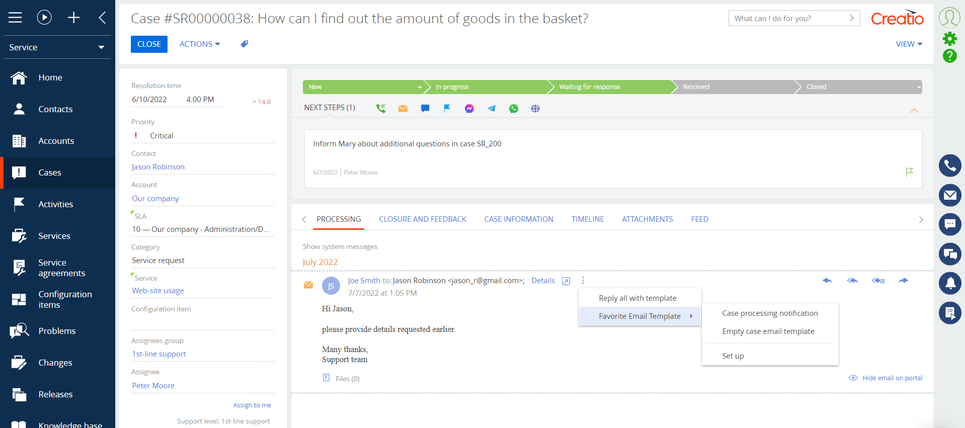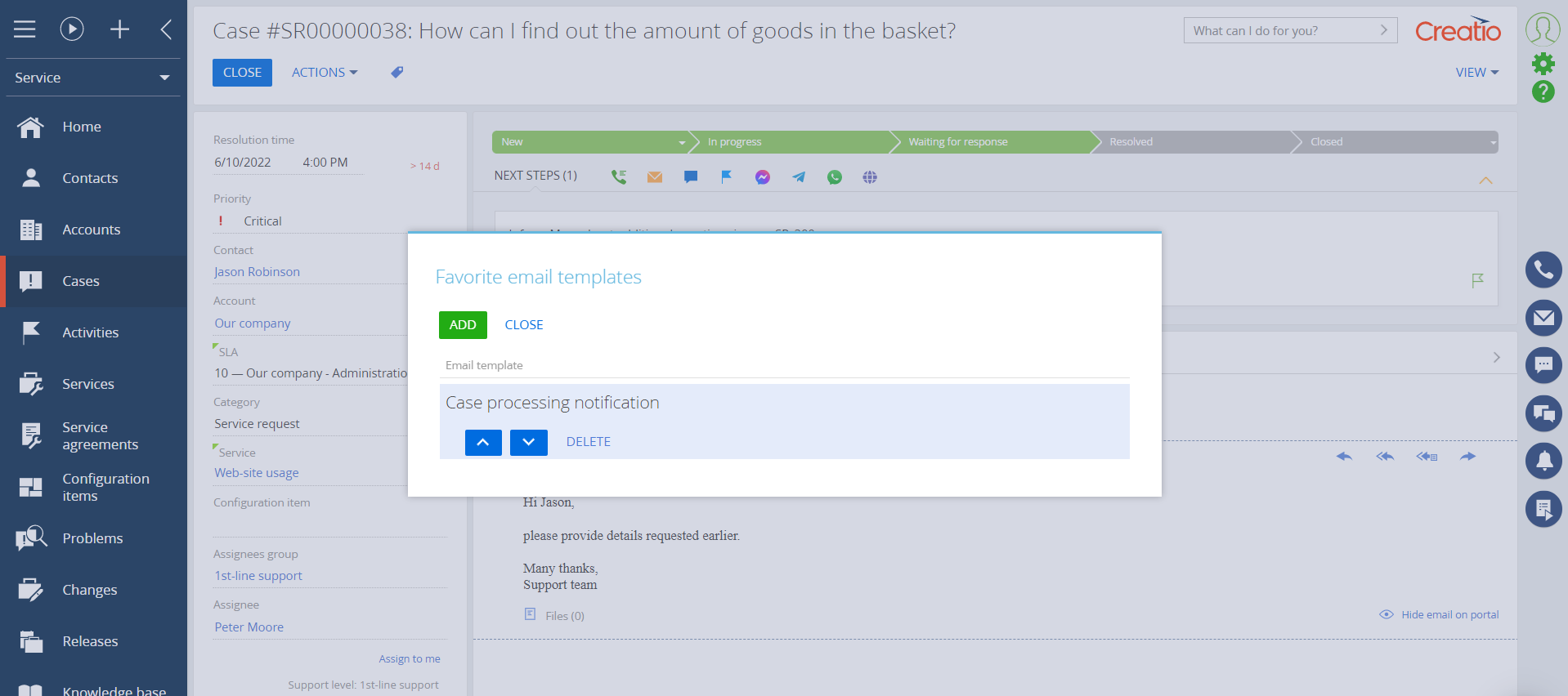 Favorite email templates in cases for Creatio allows a support operator to set a list of favorite email templates for a quick and suitable response to customer emails.