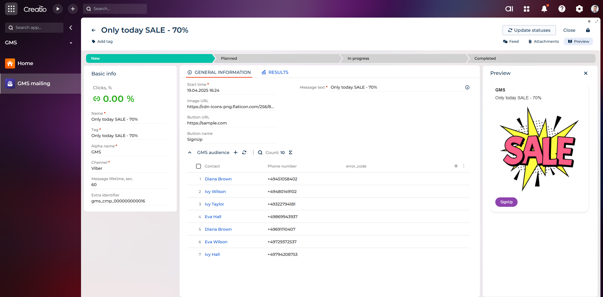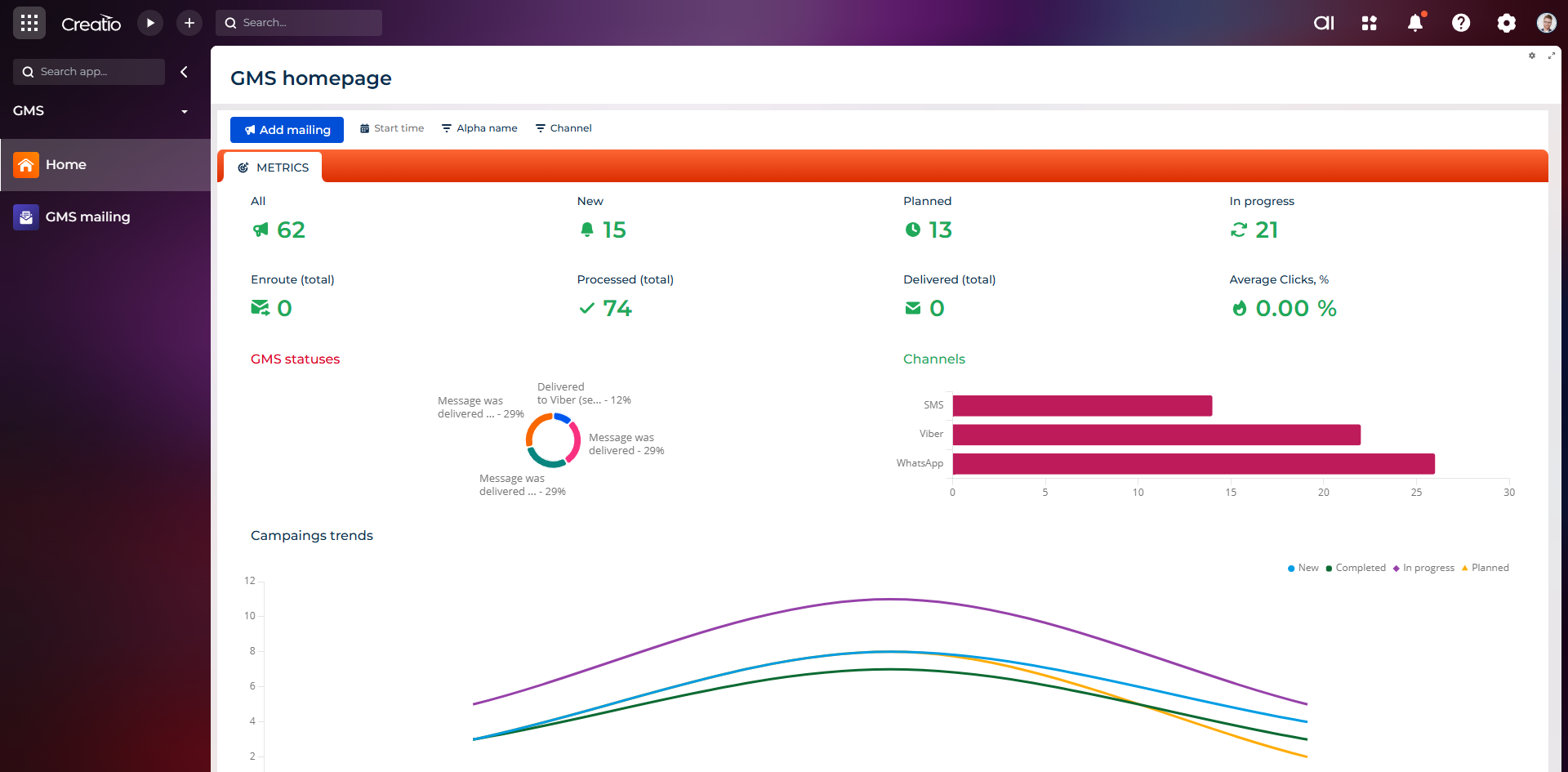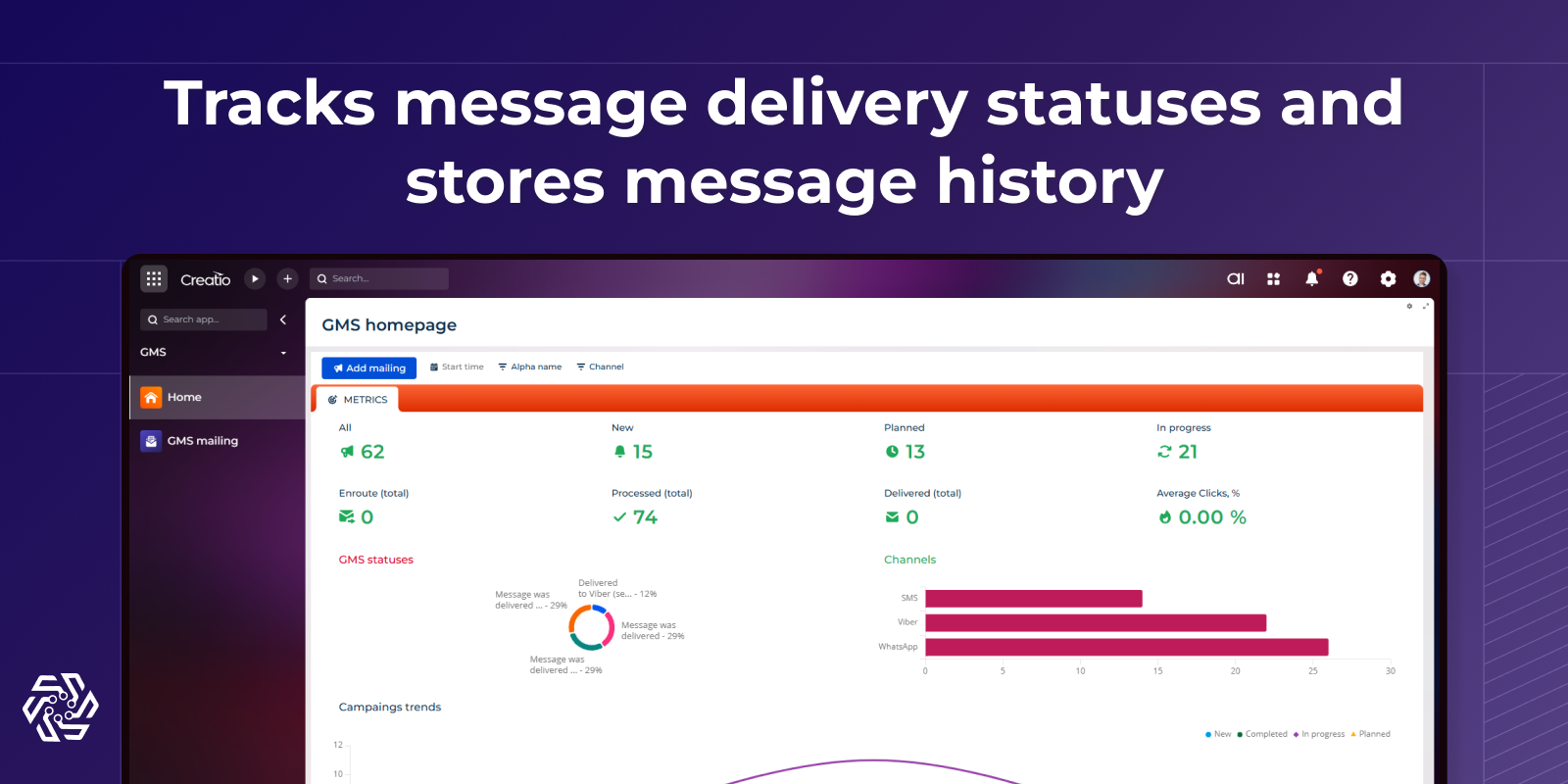 The Gms connector for Creatio enables you to send WhatsApp, SMS and Viber messages directly from your Creatio via the reliable gms communication platform. This integration streamlines customer engagement, supports automated campaigns, and provides real-time delivery tracking and analytics.