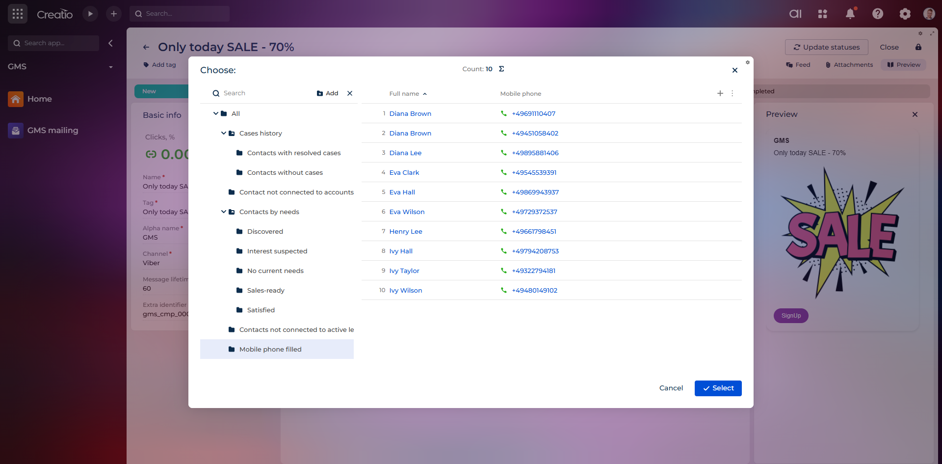 Integration module with the gms.net WhatsApp/SMS/Viber platform. The Gms connector for Creatio enables you to send WhatsApp, SMS and Viber messages directly from your Creatio via the reliable gms communication platform.