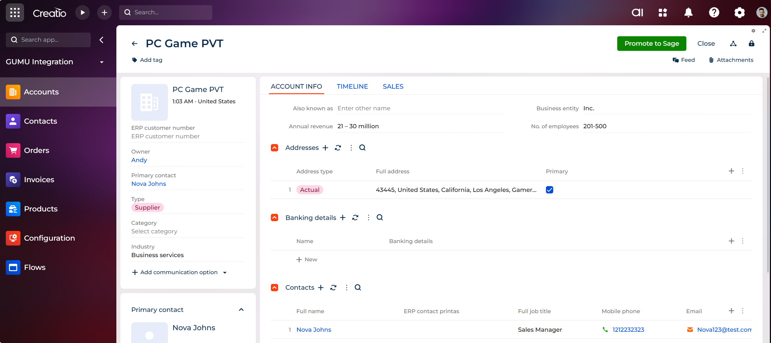 - Sales teams can access up-to-date customer and order information from Sage Intacct directly within Creatio to make informed decisions and close deals faster.