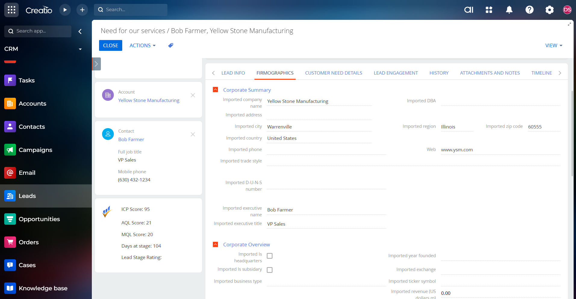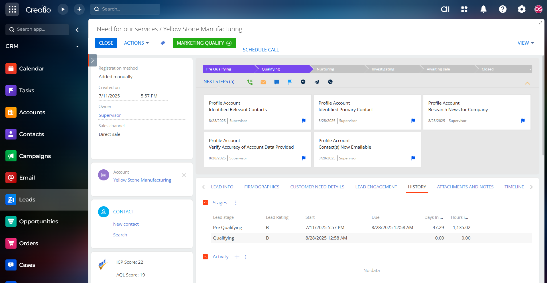 Unlock the Power of Intelligent Account Qualification (IAQ) with E6 Solutions. Our Creatio Sales platform add-on revolutionizes your marketing and sales processes, honing in on the most profitable prospects. With Intelligent Account Qualification (IAQ) combined with your Ideal Customer Profile (ICP), your teams focus their time and effort on the best, most ideal clients using industry-leading sales processes. Leads are expertly qualified, rated, and managed in a closed loop, ensuring your resources are maximized for success.