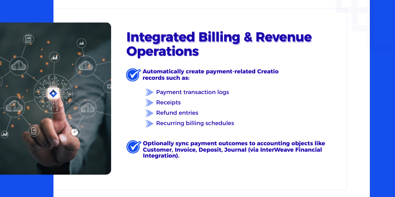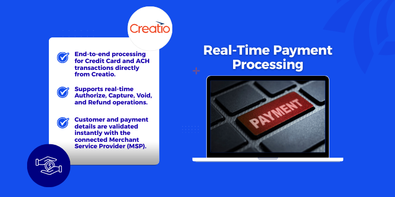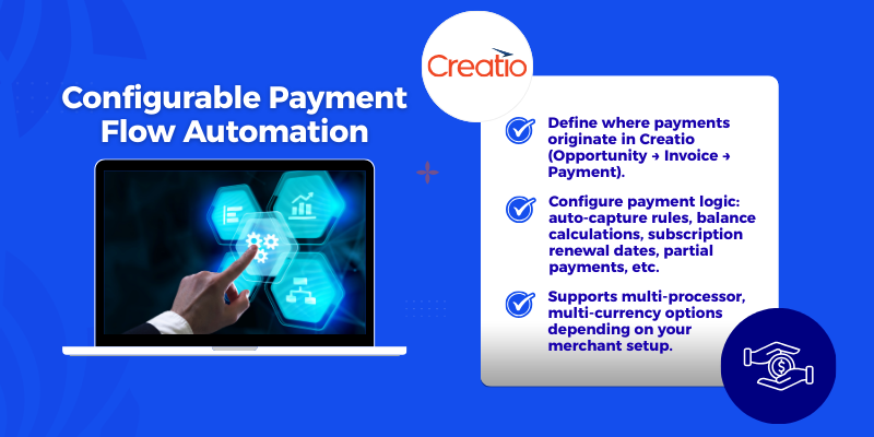 Advanced payment workflows and automation, including real-time authorization, capture, refund triggers, recurring billing events, and webhook-driven updates from payment gateways back into Creatio.