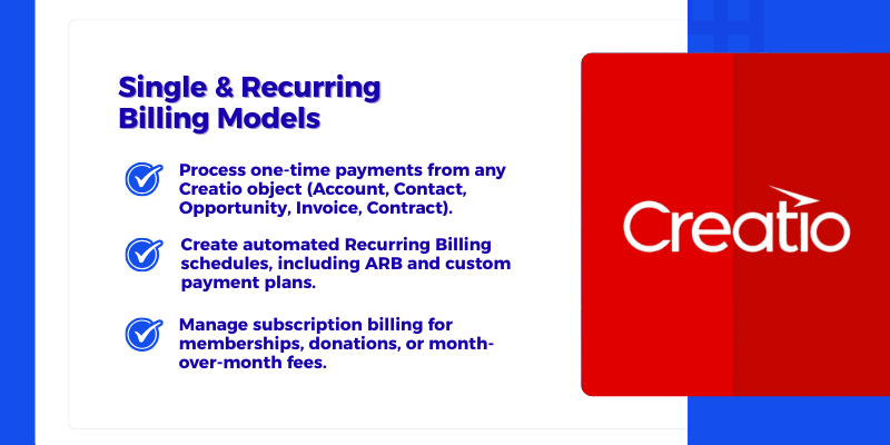 The solution supports multiple billing models that can be used independently or in combination to meet diverse business needs. These include real-time authorization with accept or decline responses, scheduled payments that automatically process remaining balances, and recurring billing options for subscription or payment-plan scenarios. Automated Recurring Billing (ARB) supports standard subscription cycles, while Custom Recurring Billing (CRB) enables flexible schedules tailored to unique billing requirements. All payment activity is surfaced directly within Creatio, ensuring visibility and control across the full payment lifecycle.