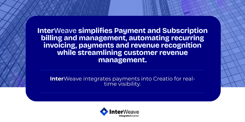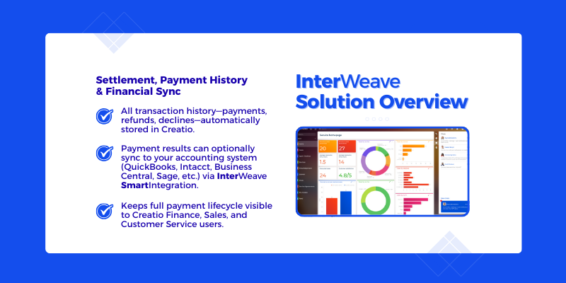 InterWeave Payment Gateway integrates Creatio with a wide range of leading payment processors, including Run Payments, Fiserv (CardPointe), Authorize.Net, Chase Paymenttech, First Data, PayPal, Cybersource, Vanco, and many others. The platform manages secure transaction routing over the internet, similar to a traditional point-of-sale terminal, but optimized for card-not-present and online payment scenarios. Built-in workflows, security controls, and monitoring ensure fast, reliable, and secure transaction processing, with the gateway operating continuously to support 24/7 payment acceptance and settlement.