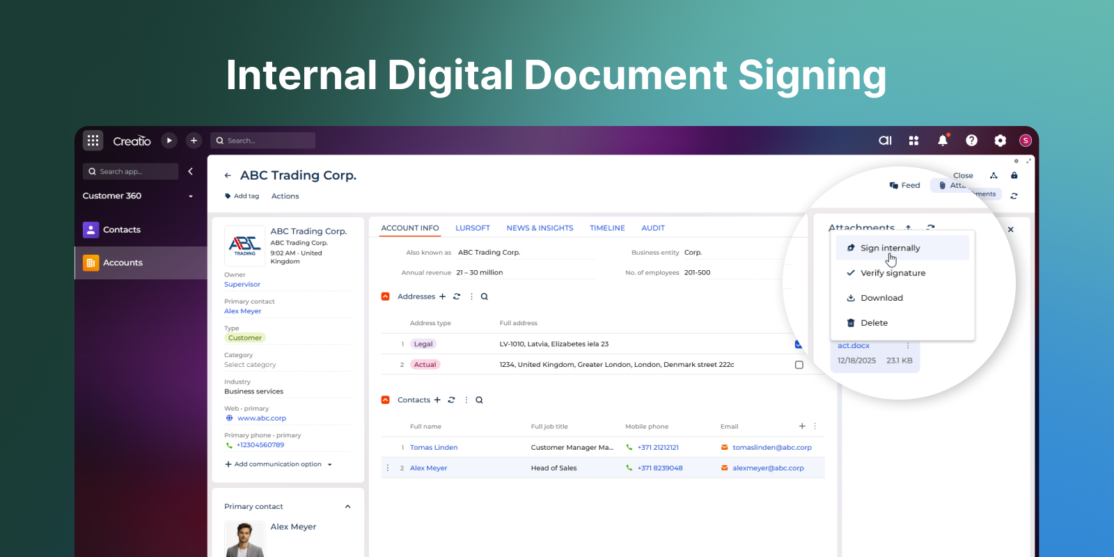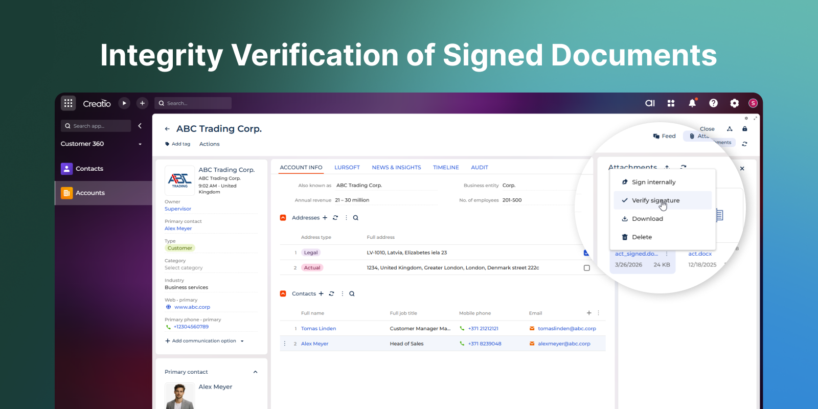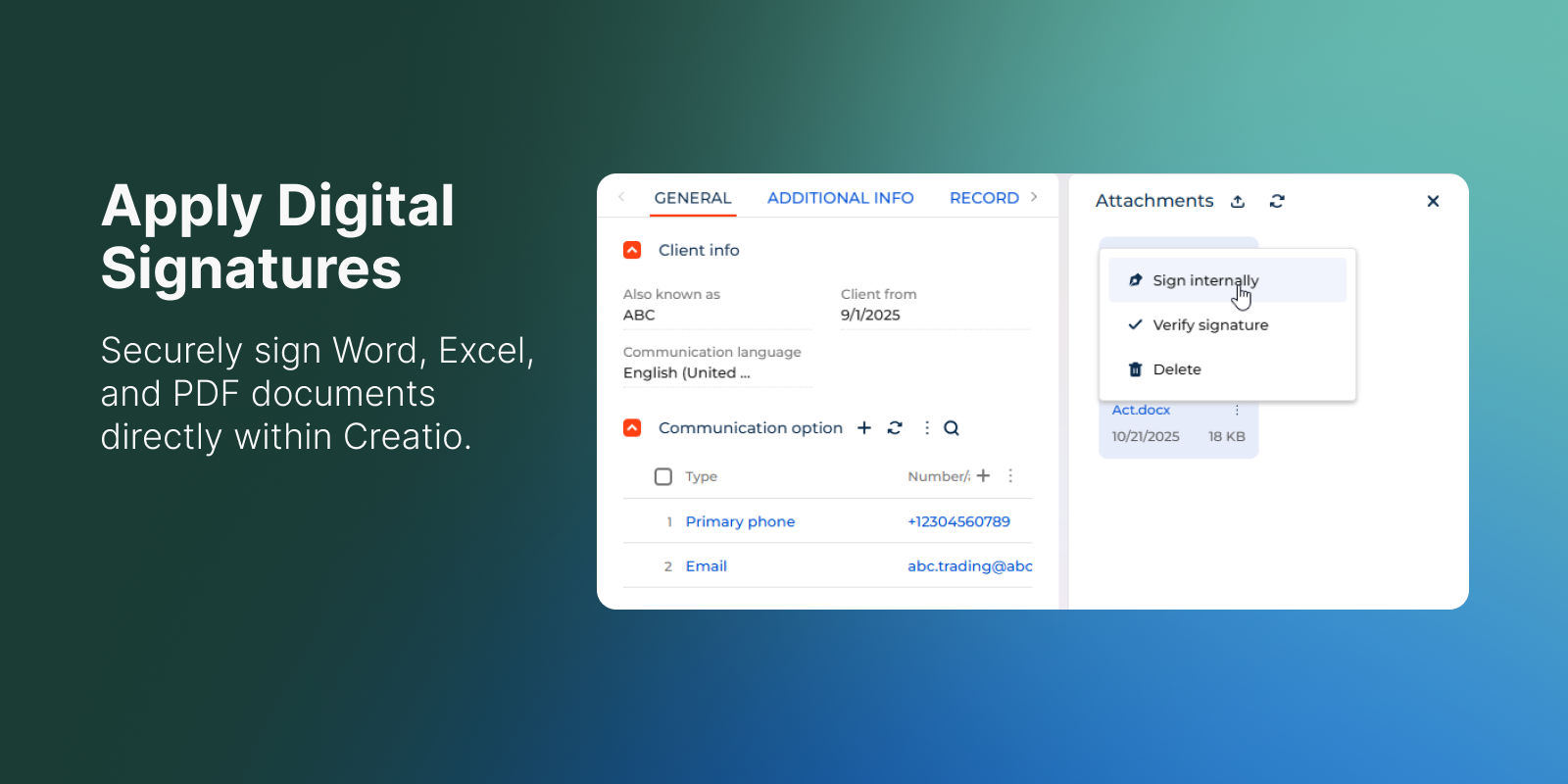 Digital signing ensures document authenticity, preserves data integrity, and keeps each file securely linked to its related record in Creatio.