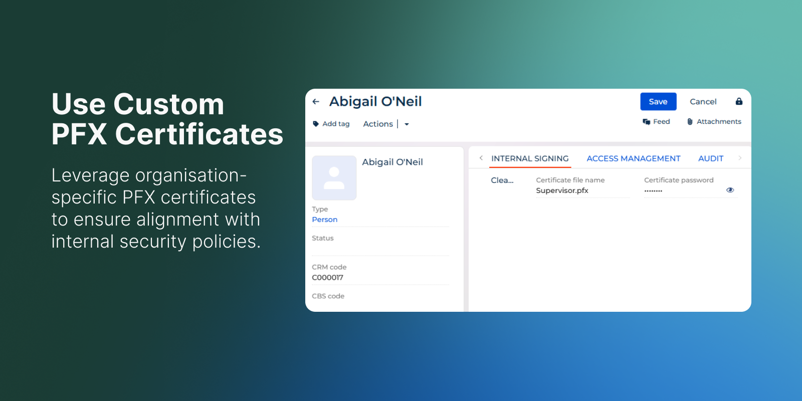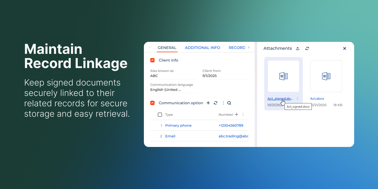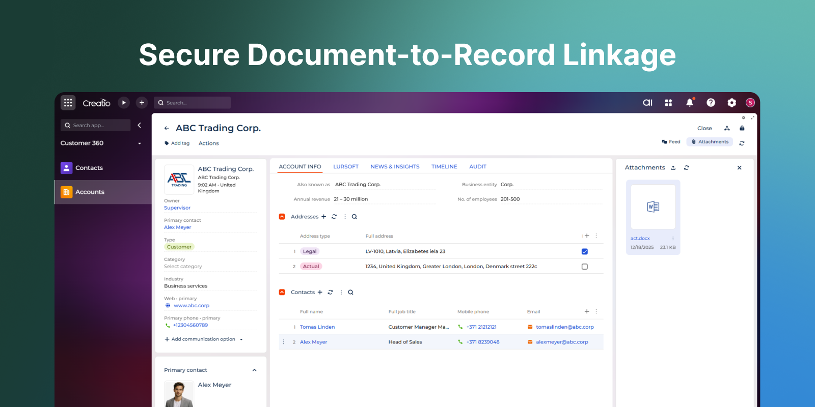 Digital signing ensures document authenticity, preserves data integrity, and keeps each file securely linked to its related record in Creatio.