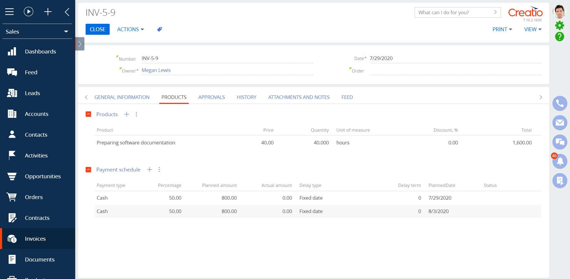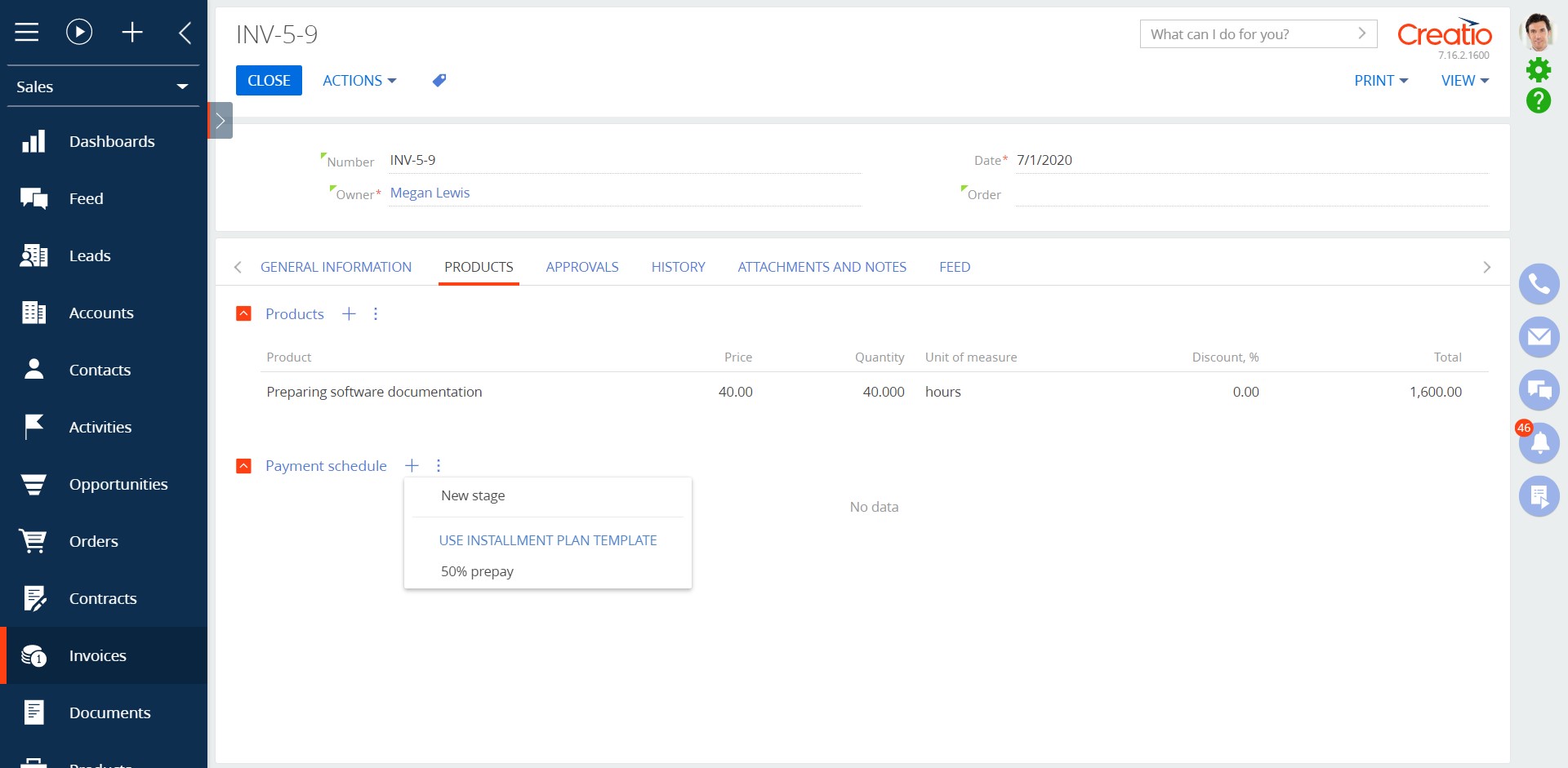 The “Invoice payment schedule for Creatio” app enables adding a payment schedule for invoices that are supposed to be paid in several installments.