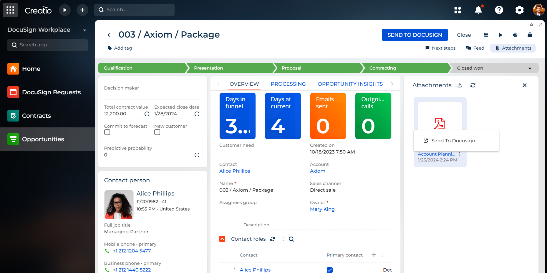 A one-stop solution to harness the synergy of Creatio workflows and DocuSign to digitally sign e-documents via a seamlessly integrated and automated flow.