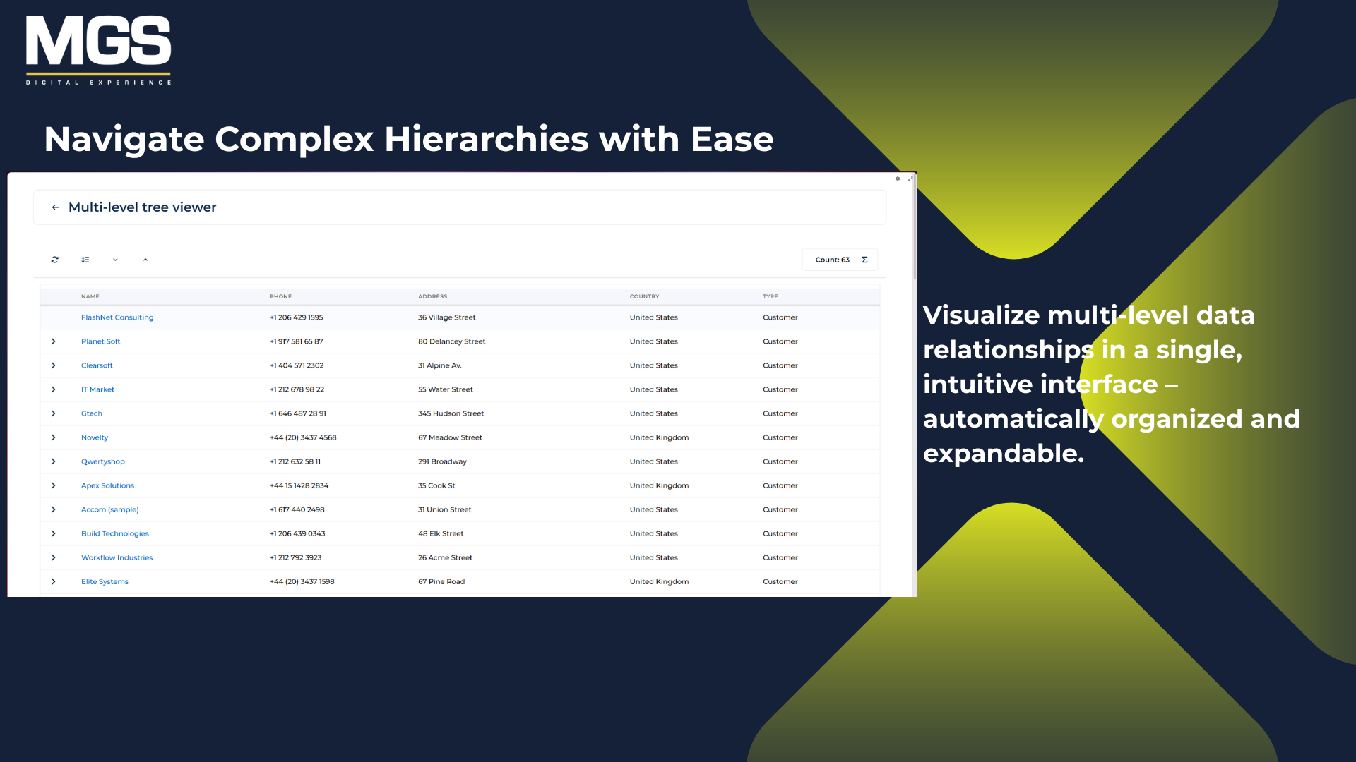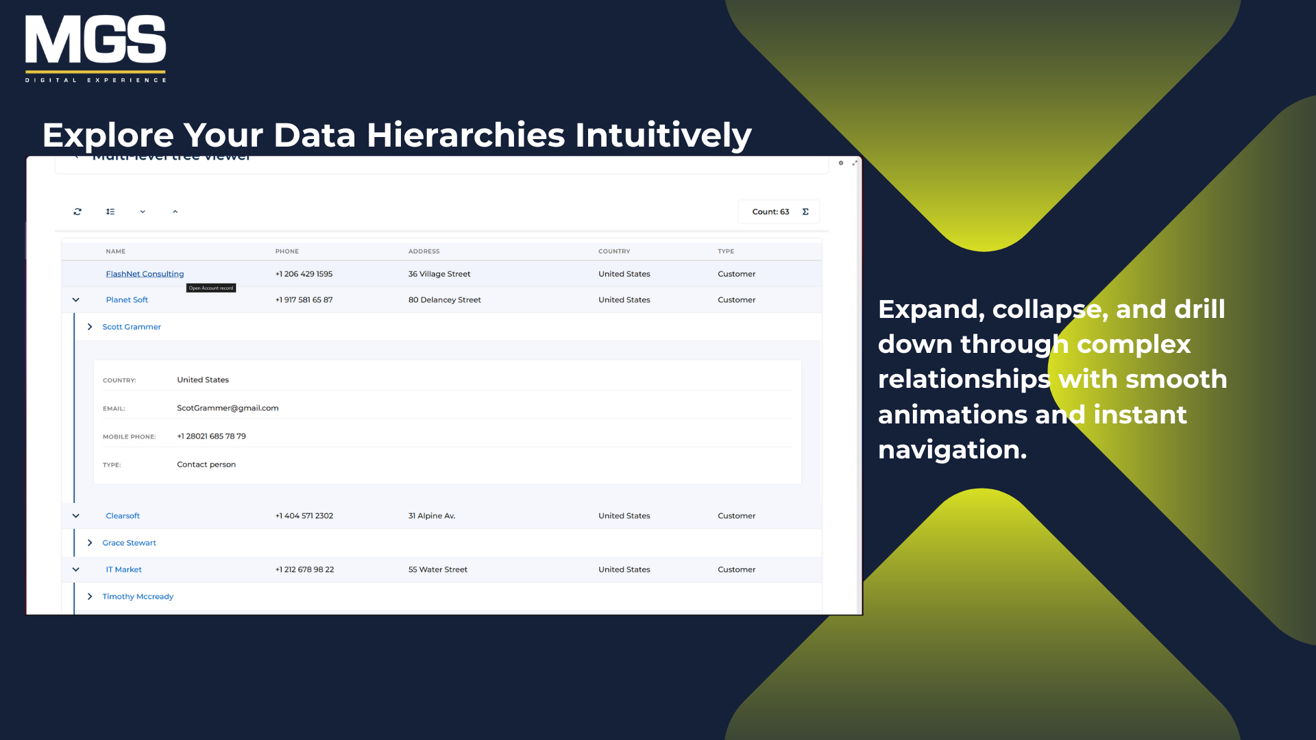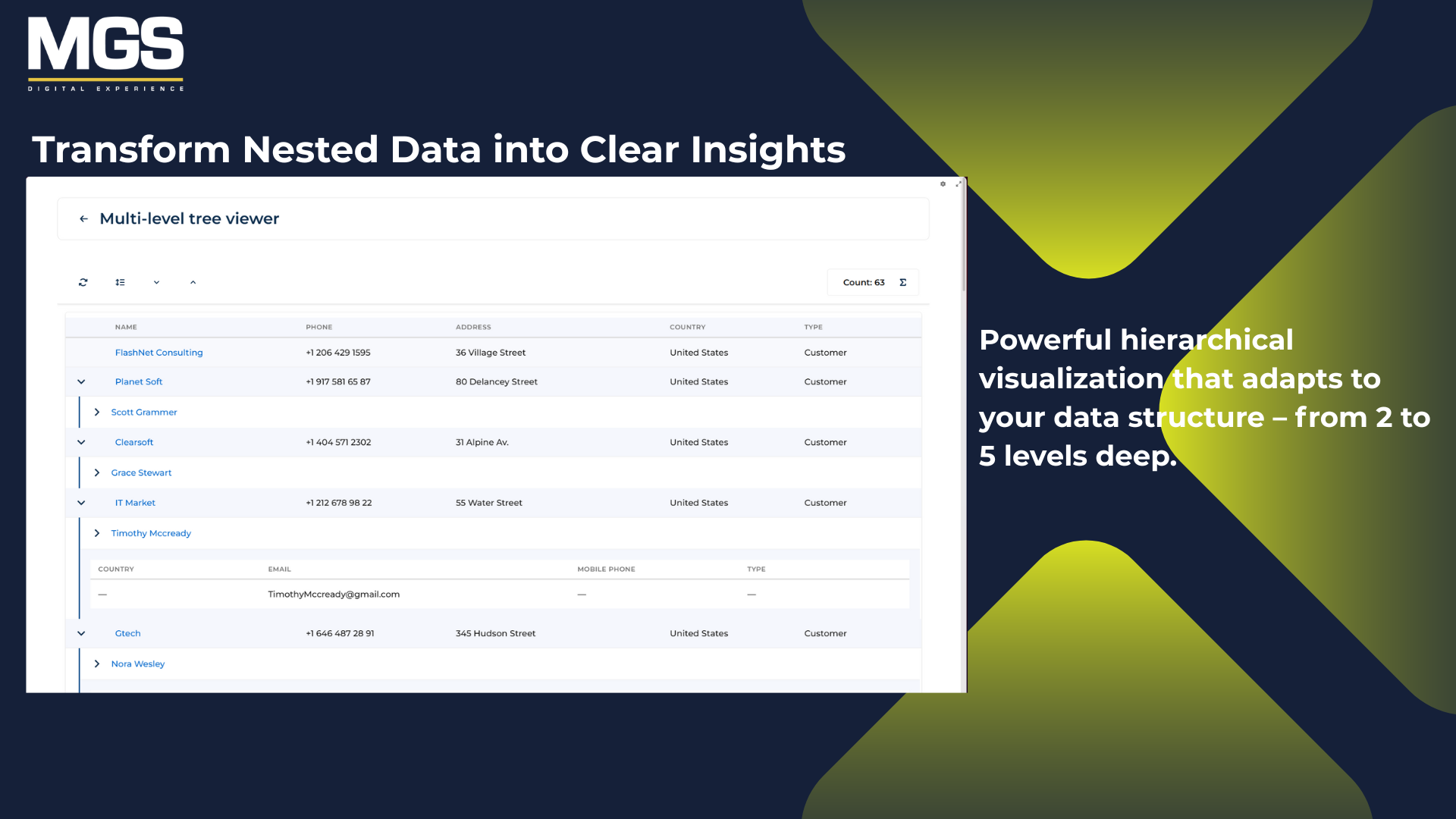 The MGS Multi-Level Tree Viewer is a Creatio custom component that displays data in a multi-level hierarchical tree. It supports self-relationships and provides an interactive, structured view of complex datasets within Creatio