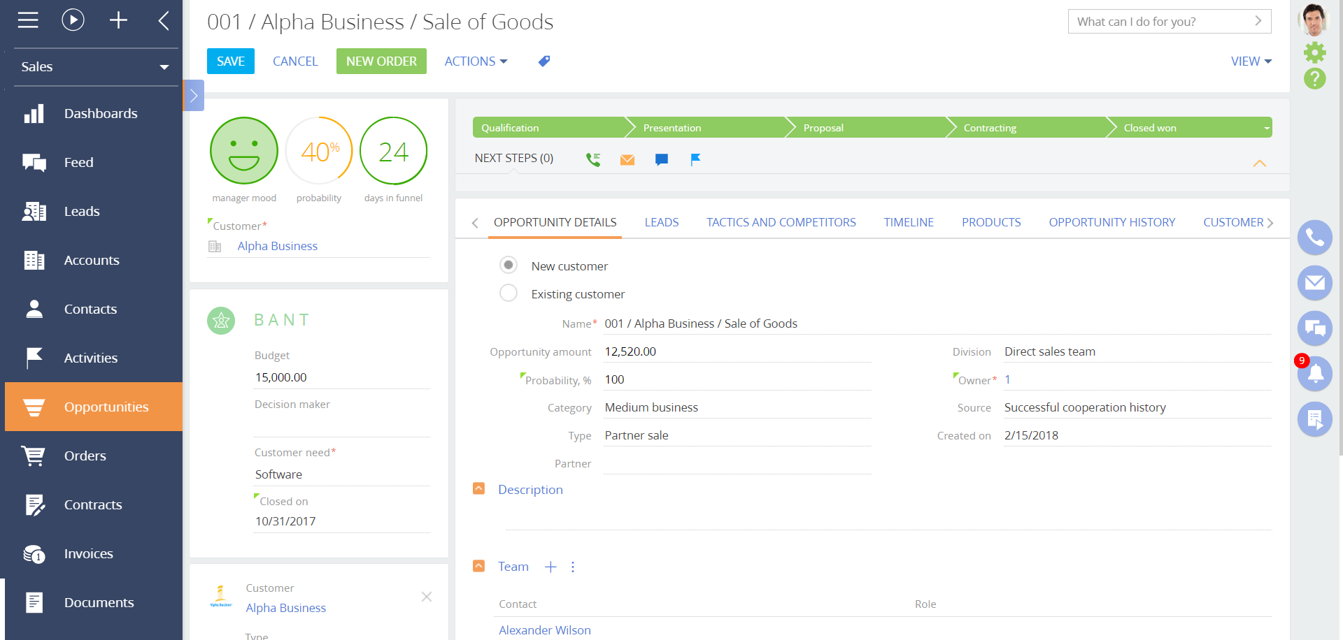 - Check the calculation. Go to "Oportunites"> "New opportunity", to fill in the fields specified in the lookup step by step, save and check the values of the "Probability" indicator.