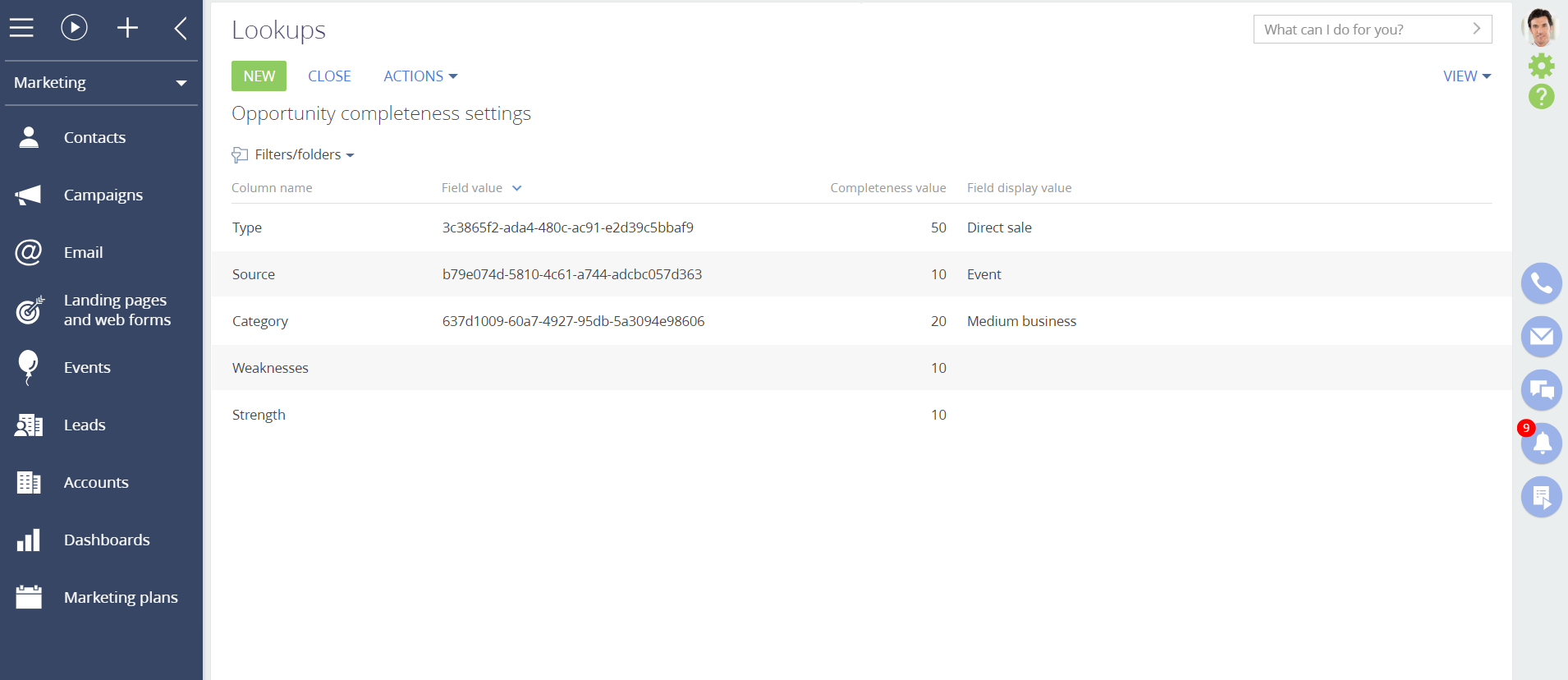 - Add fields to calculate. Go to "System settings"> "Lookups"> "Opportunity completeness settings", add all the fields that should be included in calculating the probability of opportunity. Select the value in the "Field display value" column for lookup fields.