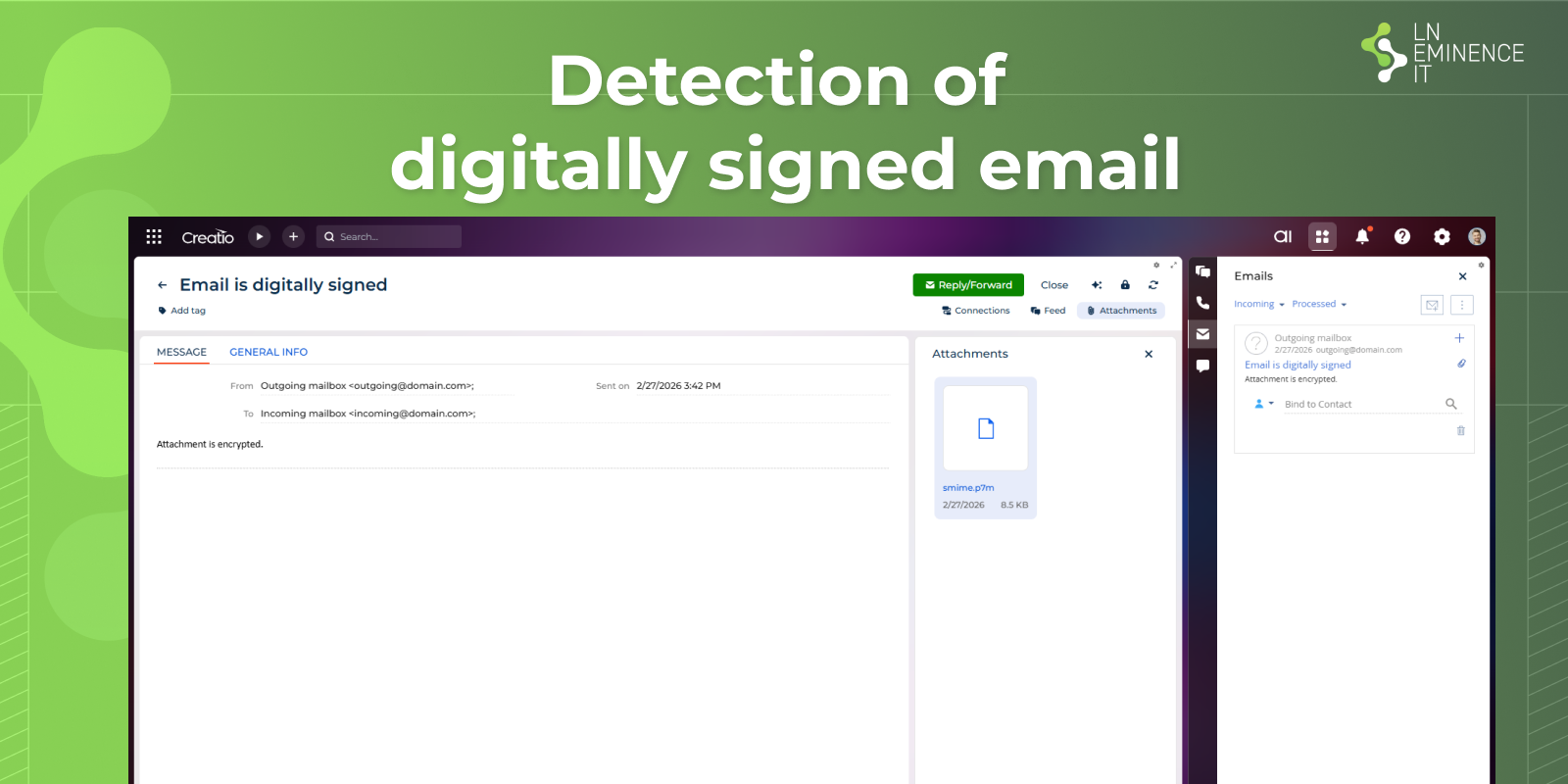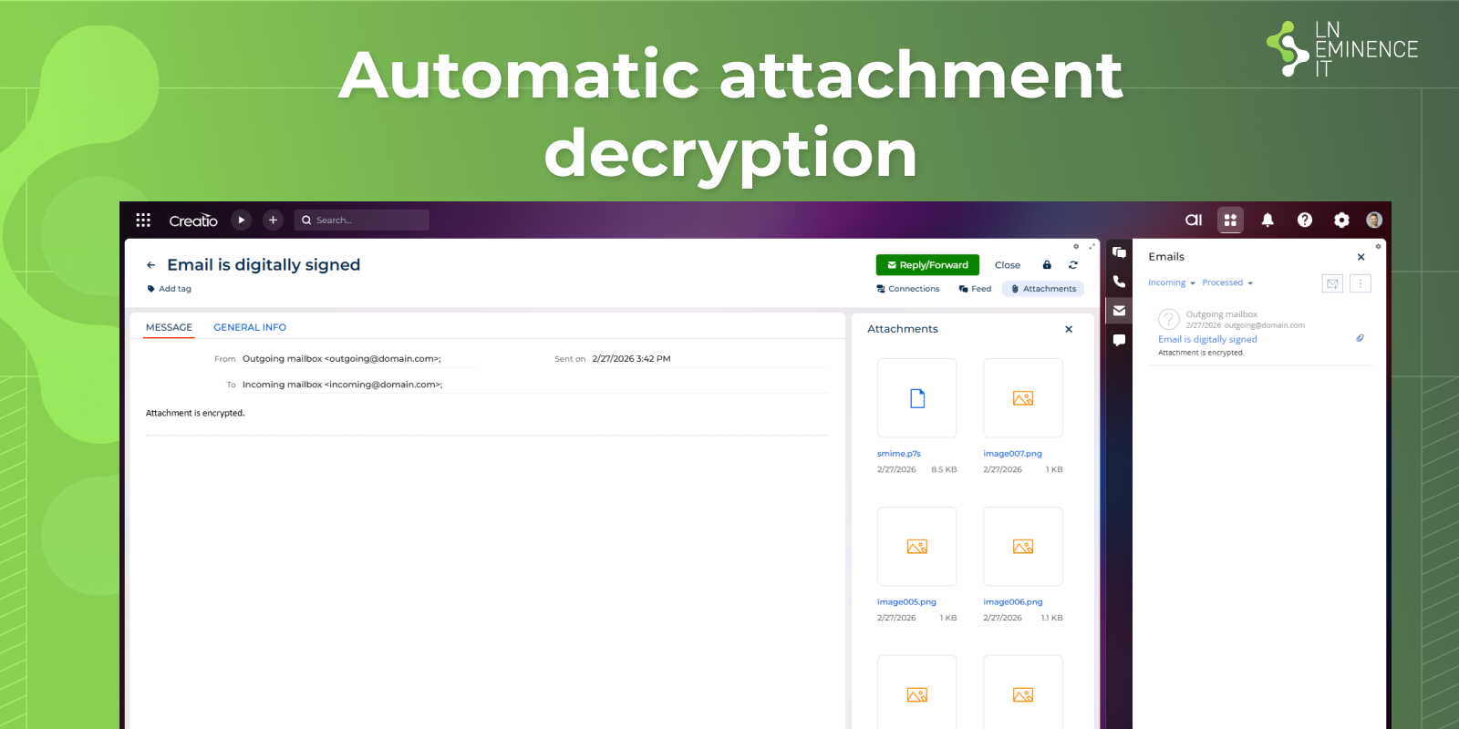 P7M Email Attachment Decryptor for Creatio application automatically decrypts S/MIME .p7m files in Email attachments.