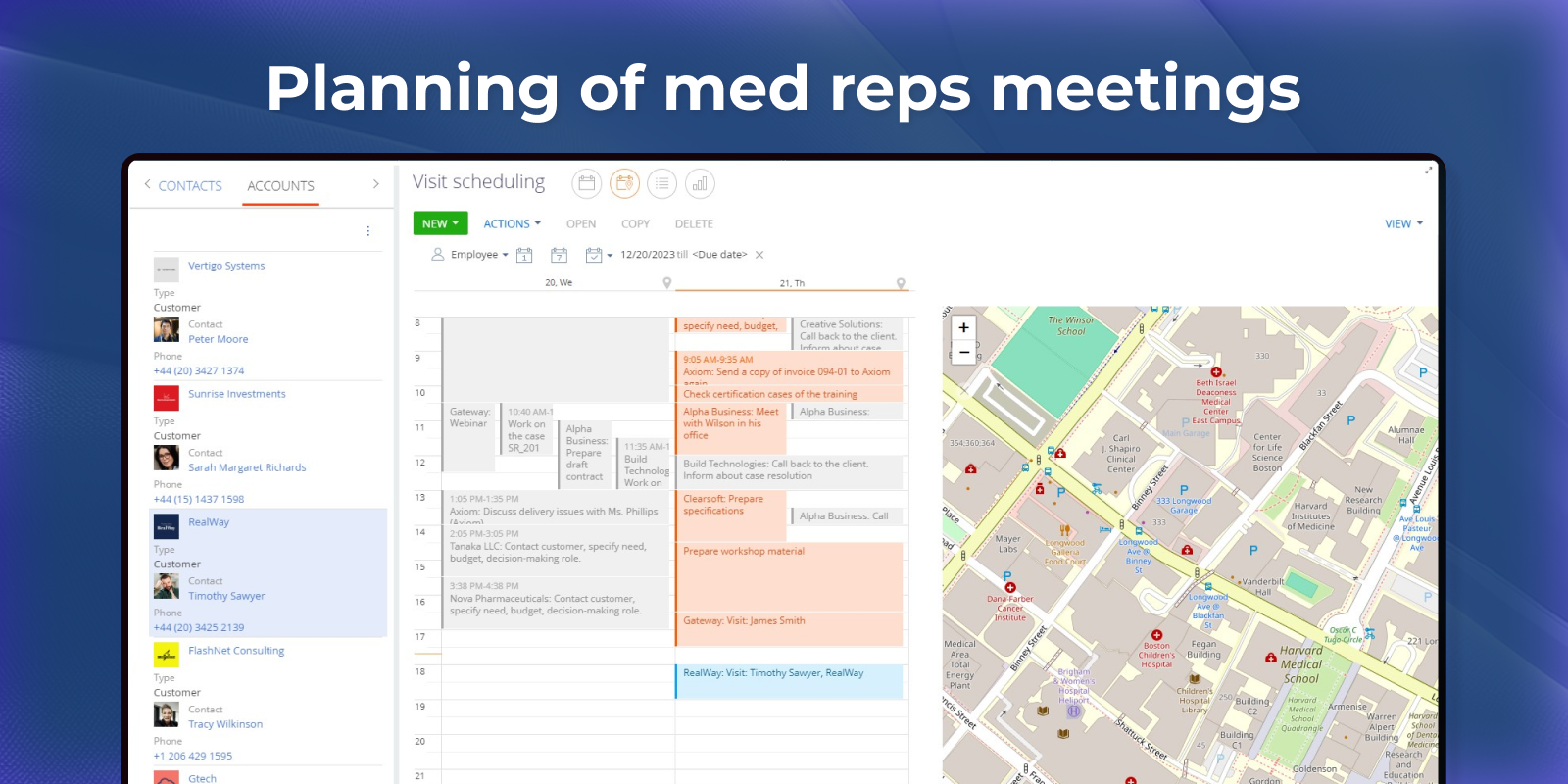 - Manage your field force using a single window interface in Pharma Creatio. Create a schedule of visits for each rep, setup rules for working with different categories of customers, monitor visits by geo-tags from field sales rep and analyze the efficiency of the department. Sales reps can view locations on a map, monitor goods availability on the stock, use plan vs actual analysis and place the results on record in the system immediately after the visit.