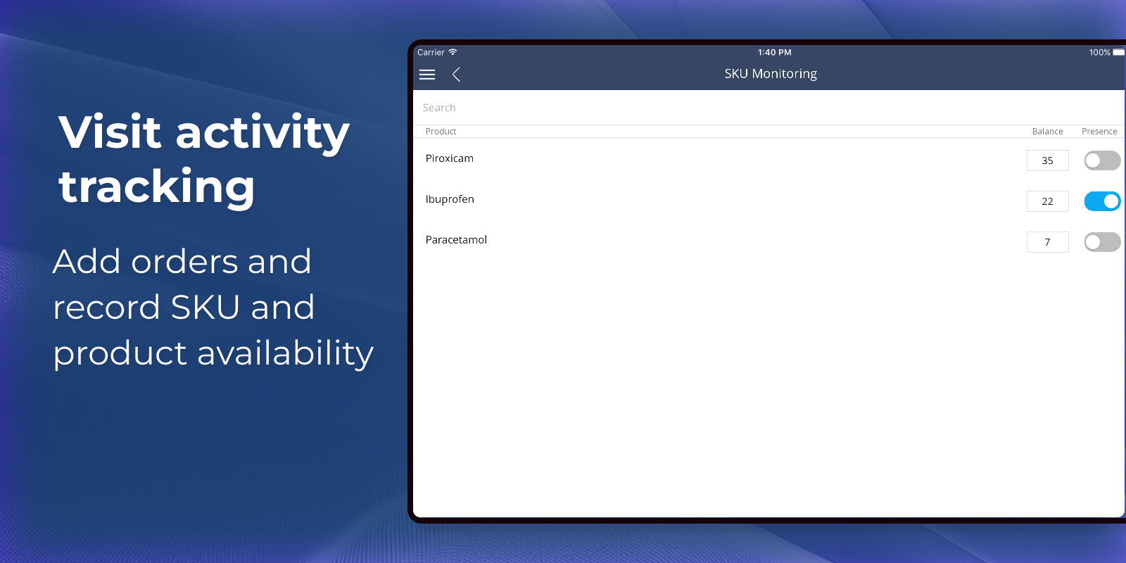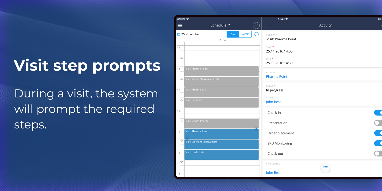 - Manage sales reps’ visits, work with active deals, keep track of products left on stock, and place orders on-site using the Creatio mobile app. The system keeps track of all necessary changes. Pharma Creatio mobile app can be used in both online and offline mode.