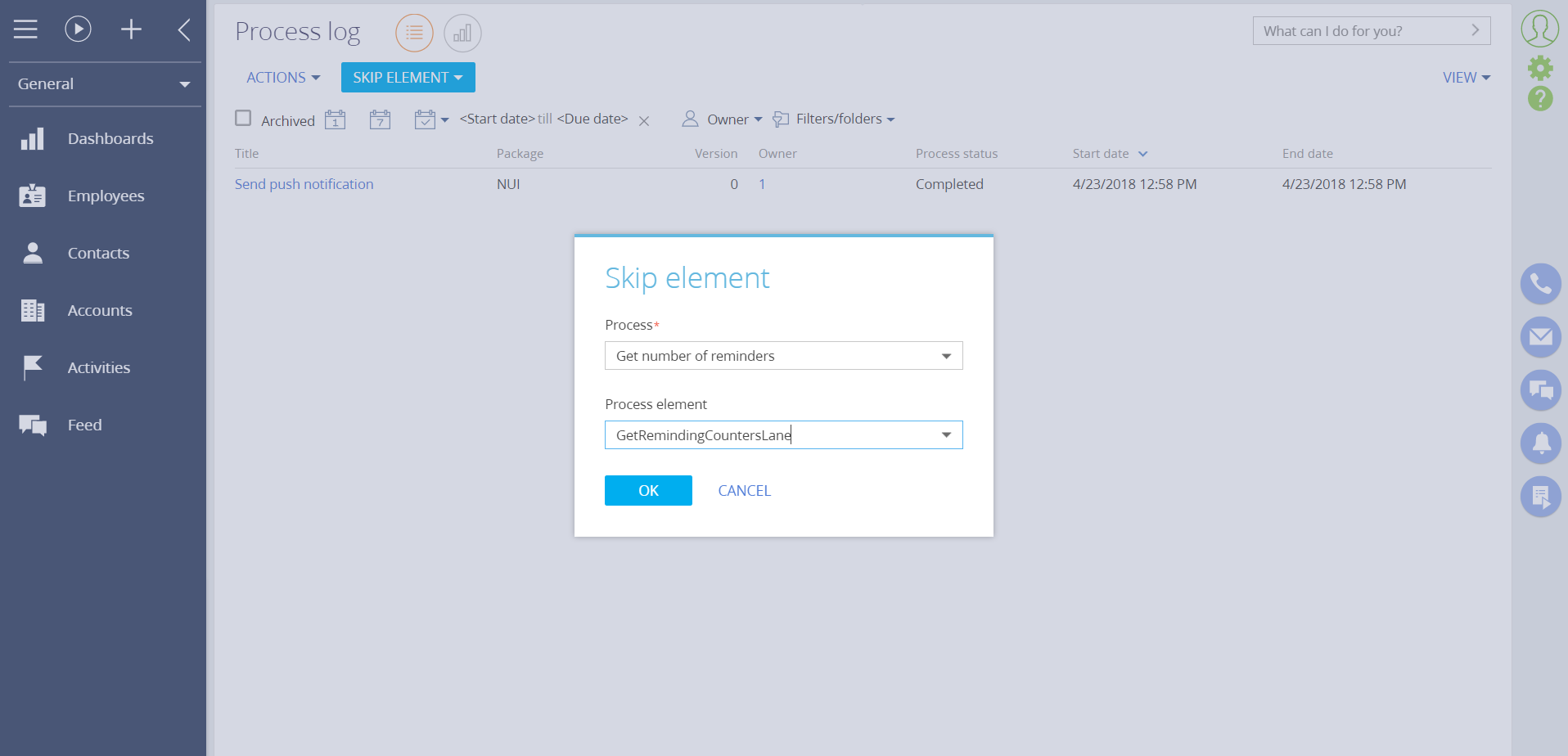1. Skip element. Go to "System designer" > "Process log" > "Skip element", specify process and process element that should be skipped, press "Ok" button.