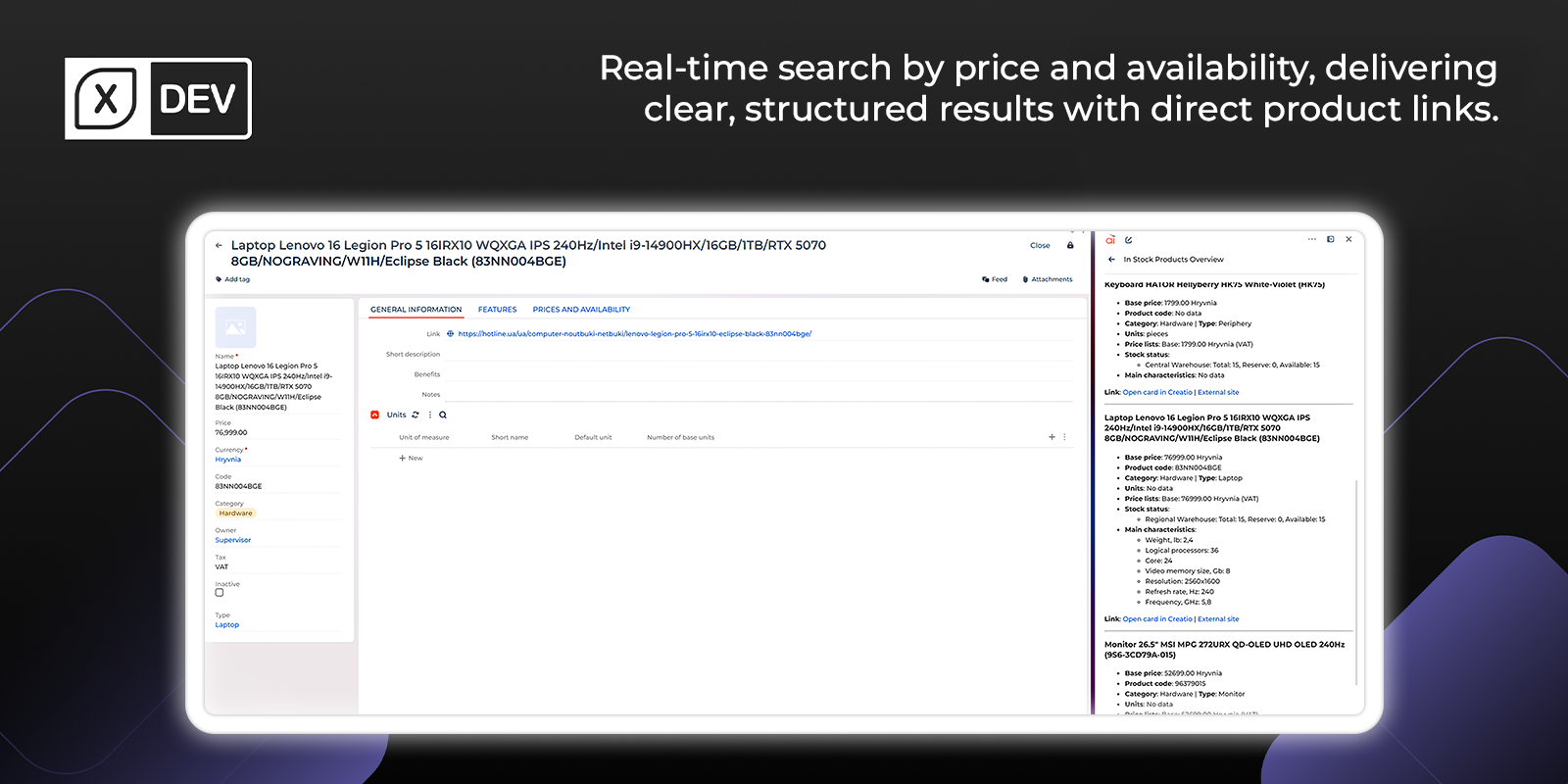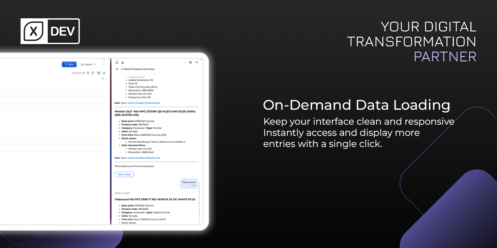 Agent processes natural language queries with slang, abbreviation, and typo recognition to search in the product catalog, obtain price lists, check warehouse balances, and extract product specifications. The solution ensures strict compliance with existing records and displays data with pagination and filtering, allowing users to seamlessly load additional search results at the click of a button without duplication or data gaps.