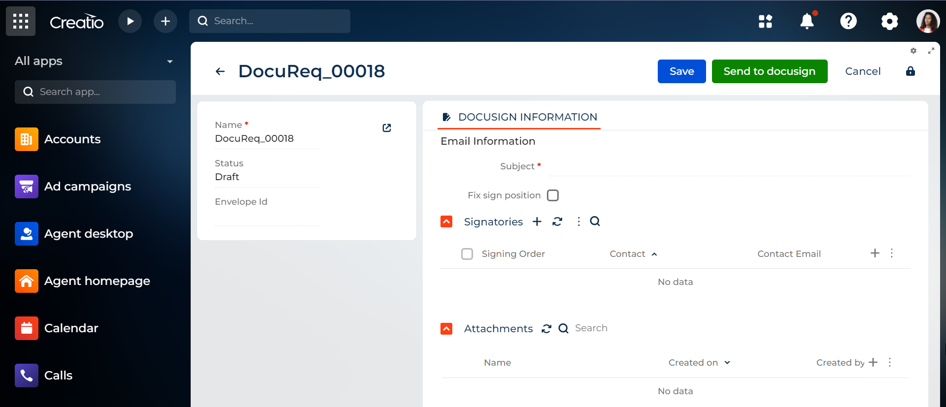 The DocuSign integration for Creatio enables users to send documents that need to be digitally signed directly from Creatio UI.