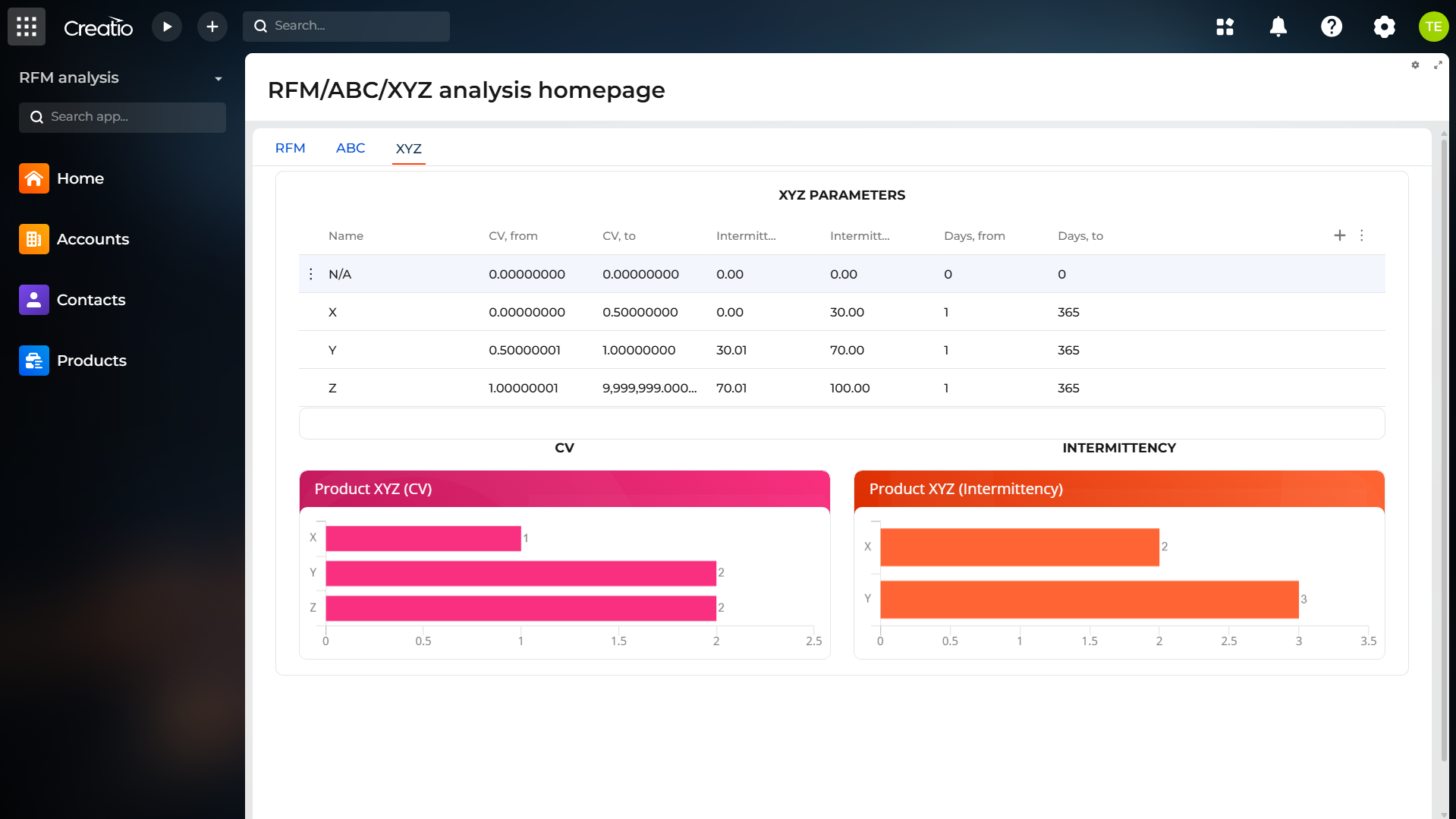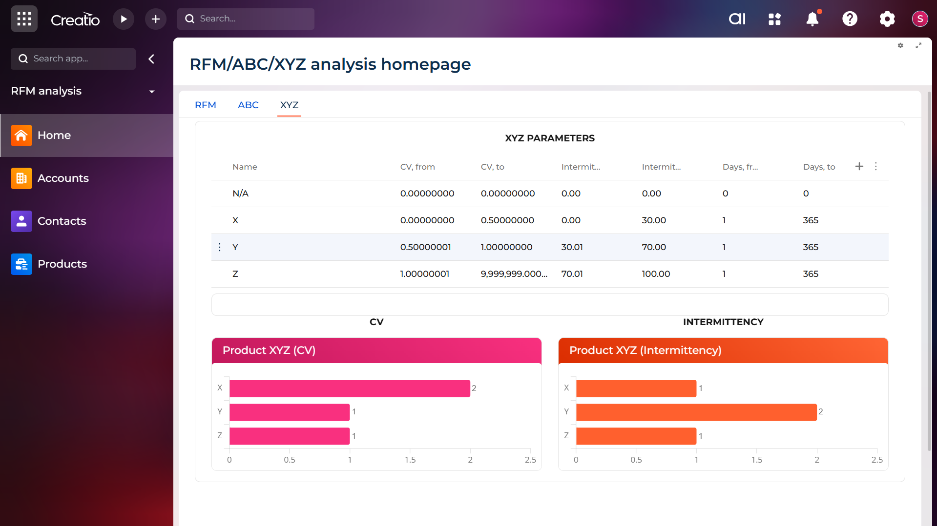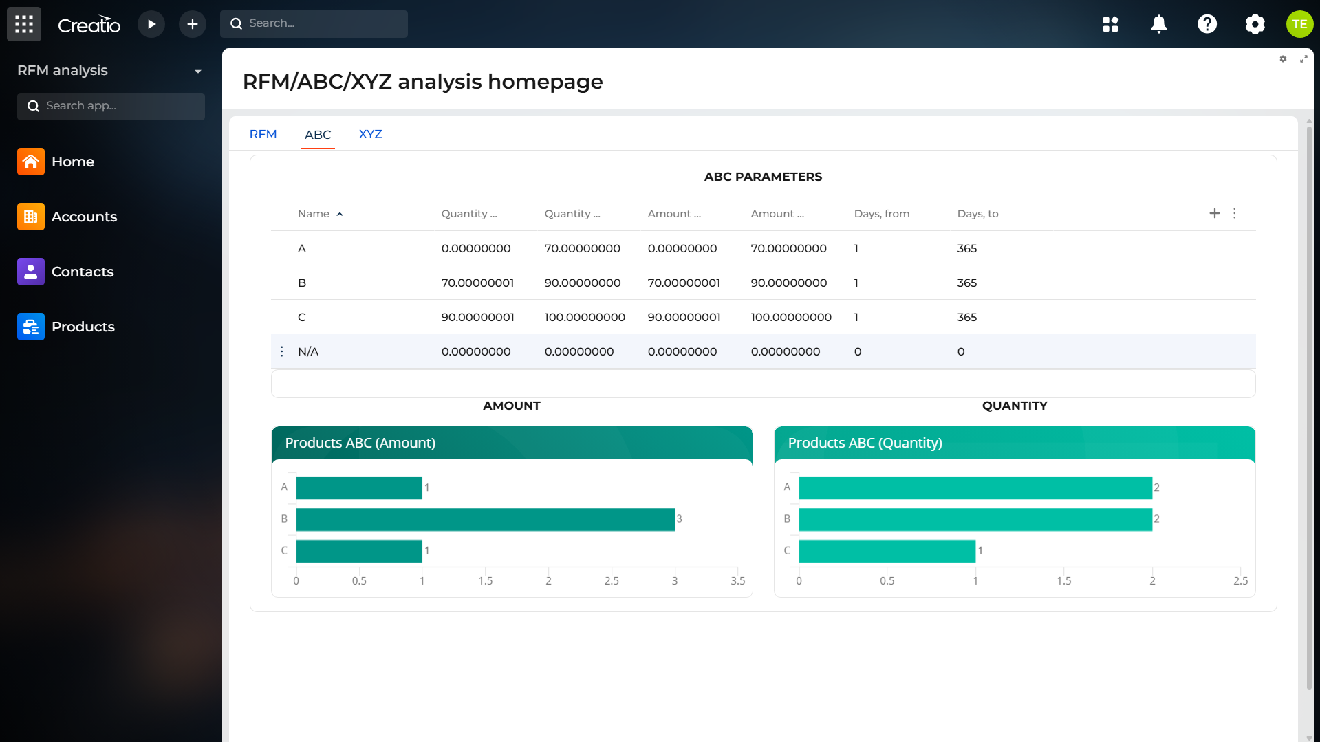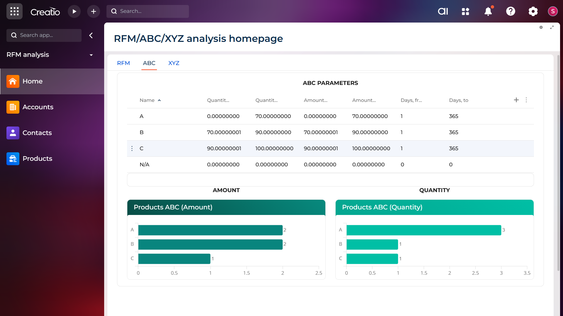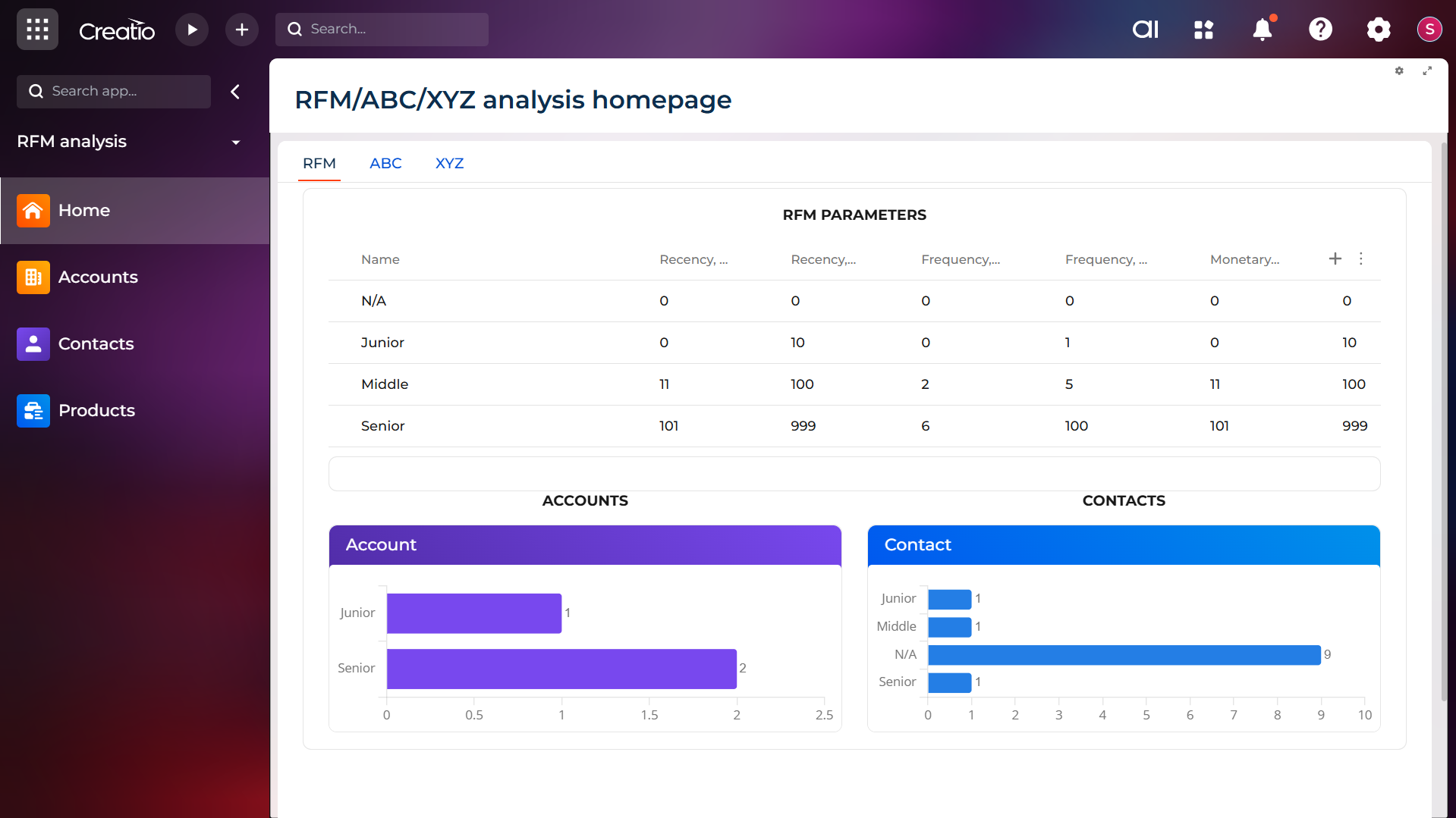 This app enables comprehensive RFM/ABC/XYZ analysis in Creatio using sales data from the Orders section. It automatically segments B2C customers (Contacts), B2B customers (Accounts), and Products into user-defined categories based on recency, frequency, and monetary value. Users can fully customize the RFM/ABC/XYZ parameter ranges for each category, enabling flexible segmentation. The app automatically updates RFM data for the entire database monthly, ensuring that segmentation always reflects the most current information.