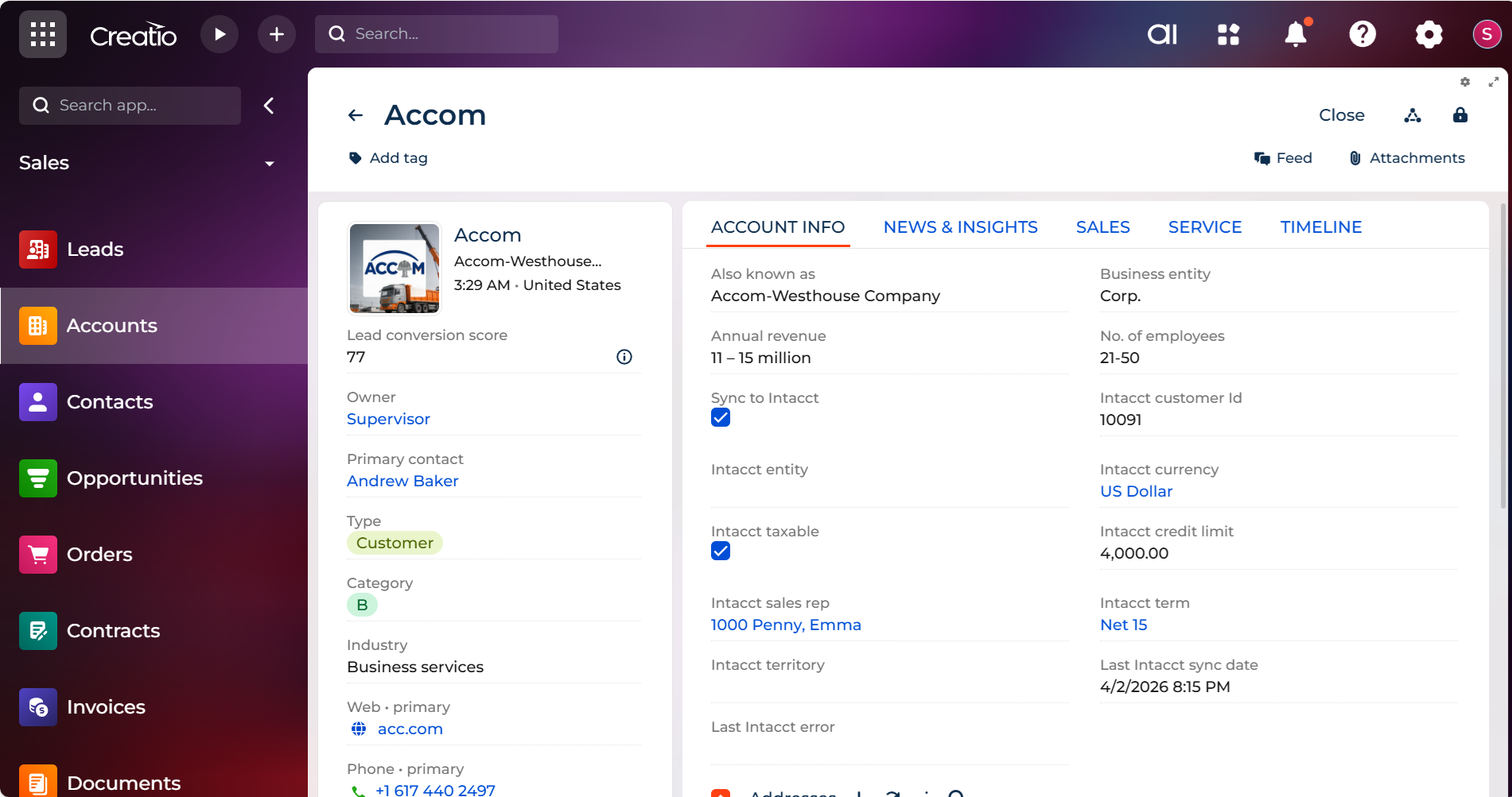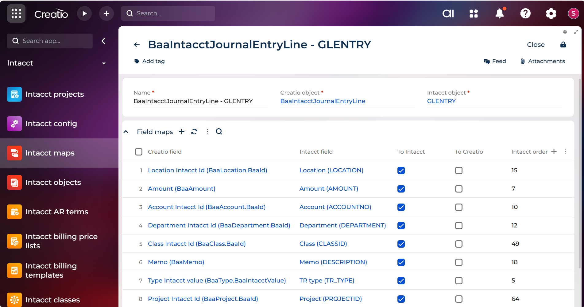 The Sage Intacct connector for Creatio unifies CRM and financial operations for greater efficiency and insight. Leveraging native and custom objects, the connector enables seamless uni- and bi-directional synchronization of customer data, products, orders, journal entries, contracts, projects and custom objects.