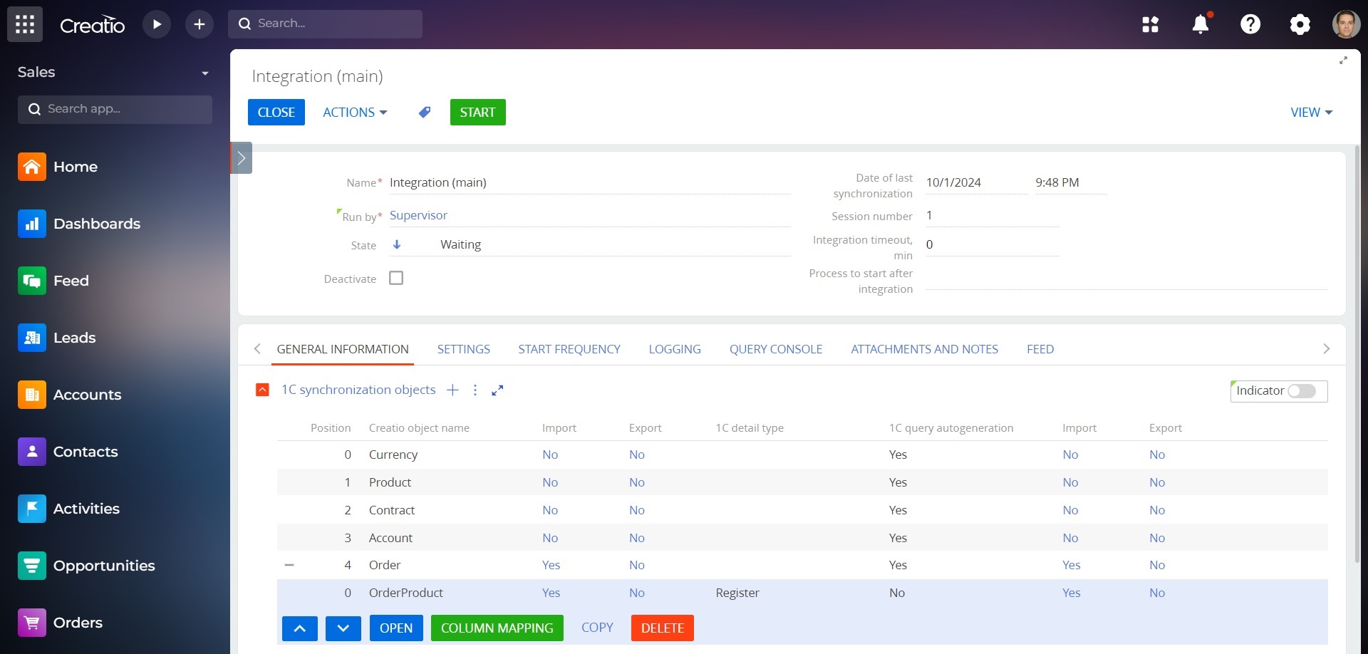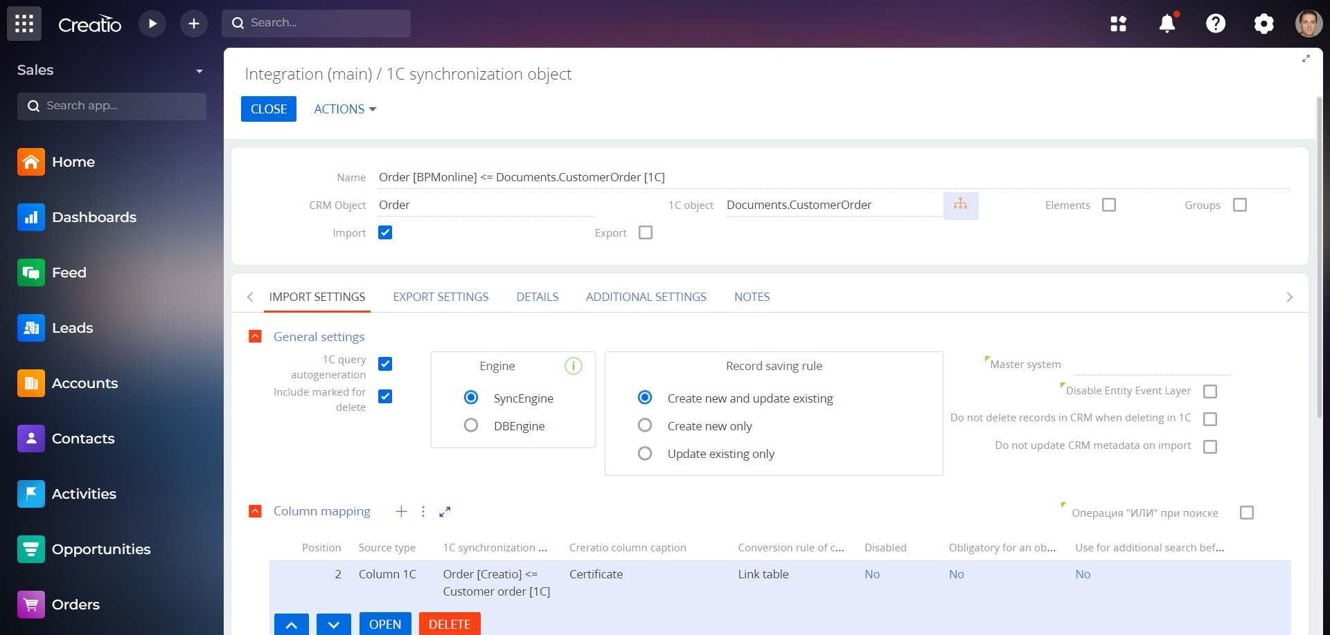 Setting up one-way and two-way data exchange between 1C and the Creatio system using the Creatio system interface