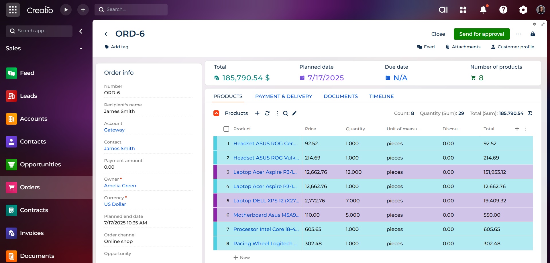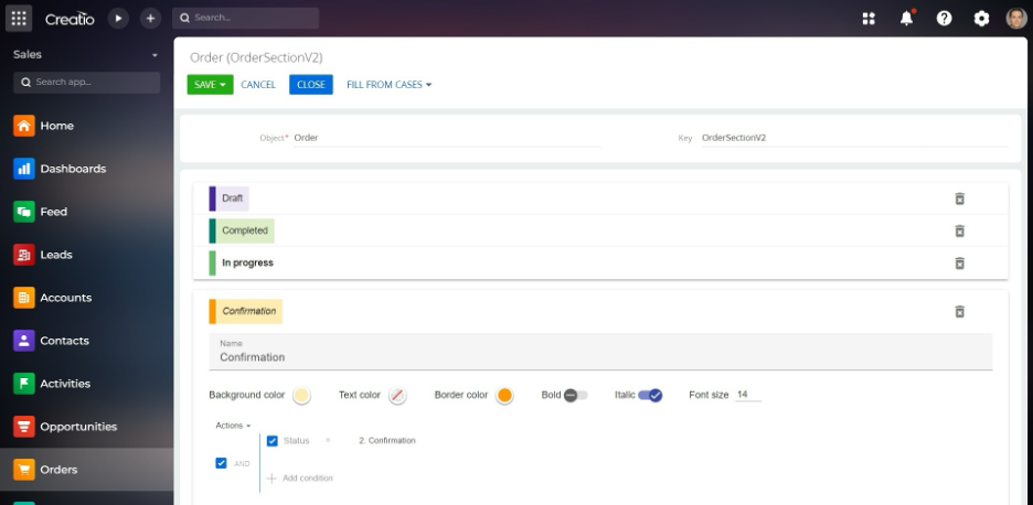 While working with Orders, there is an opportunity to change the record’s border color depending on the Account; make text bold for those records, where the payment is overdue; change the record’s background and text color for those orders, where there is a product with a specified category and a number of such products is higher than a set figure.
