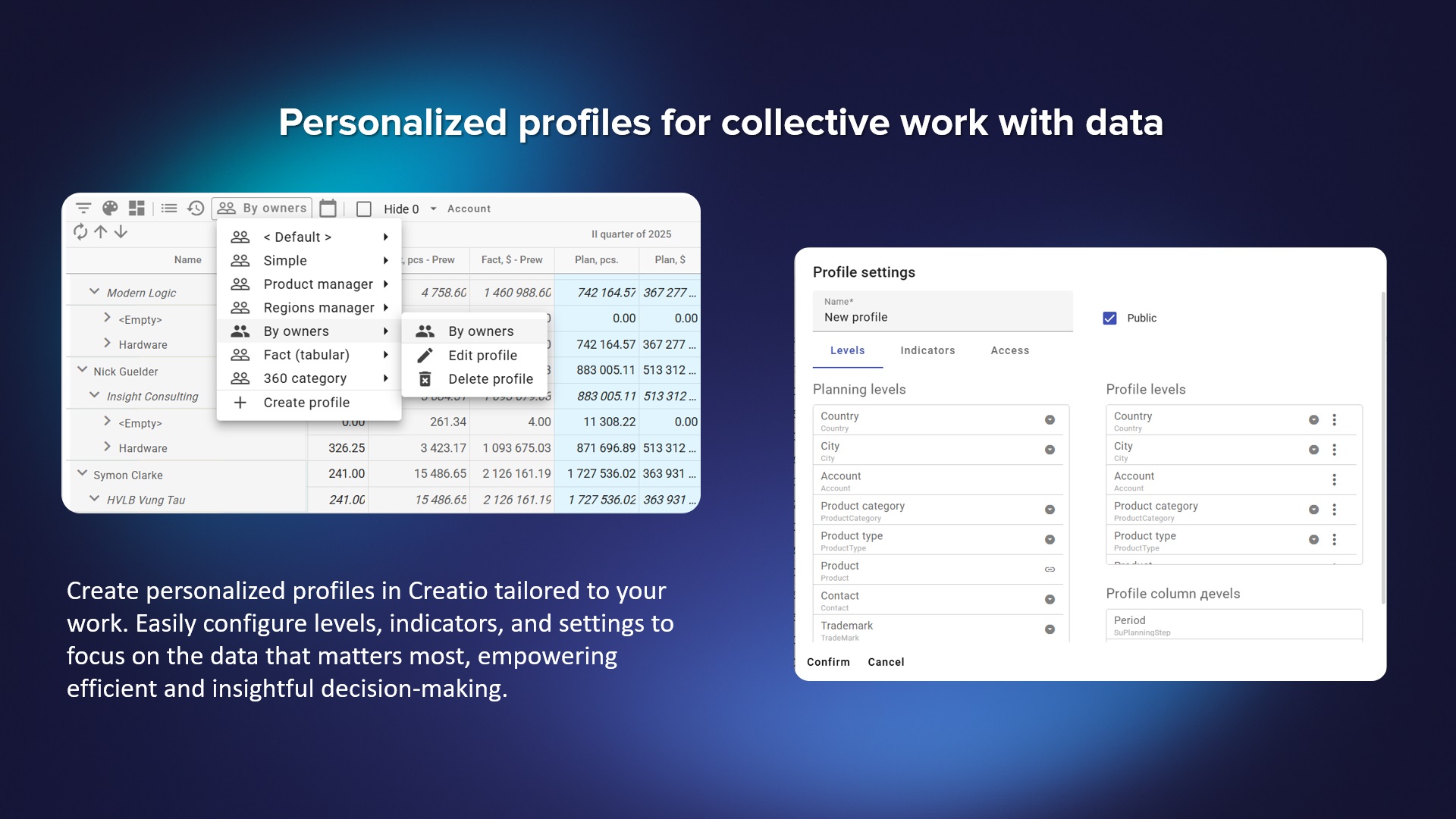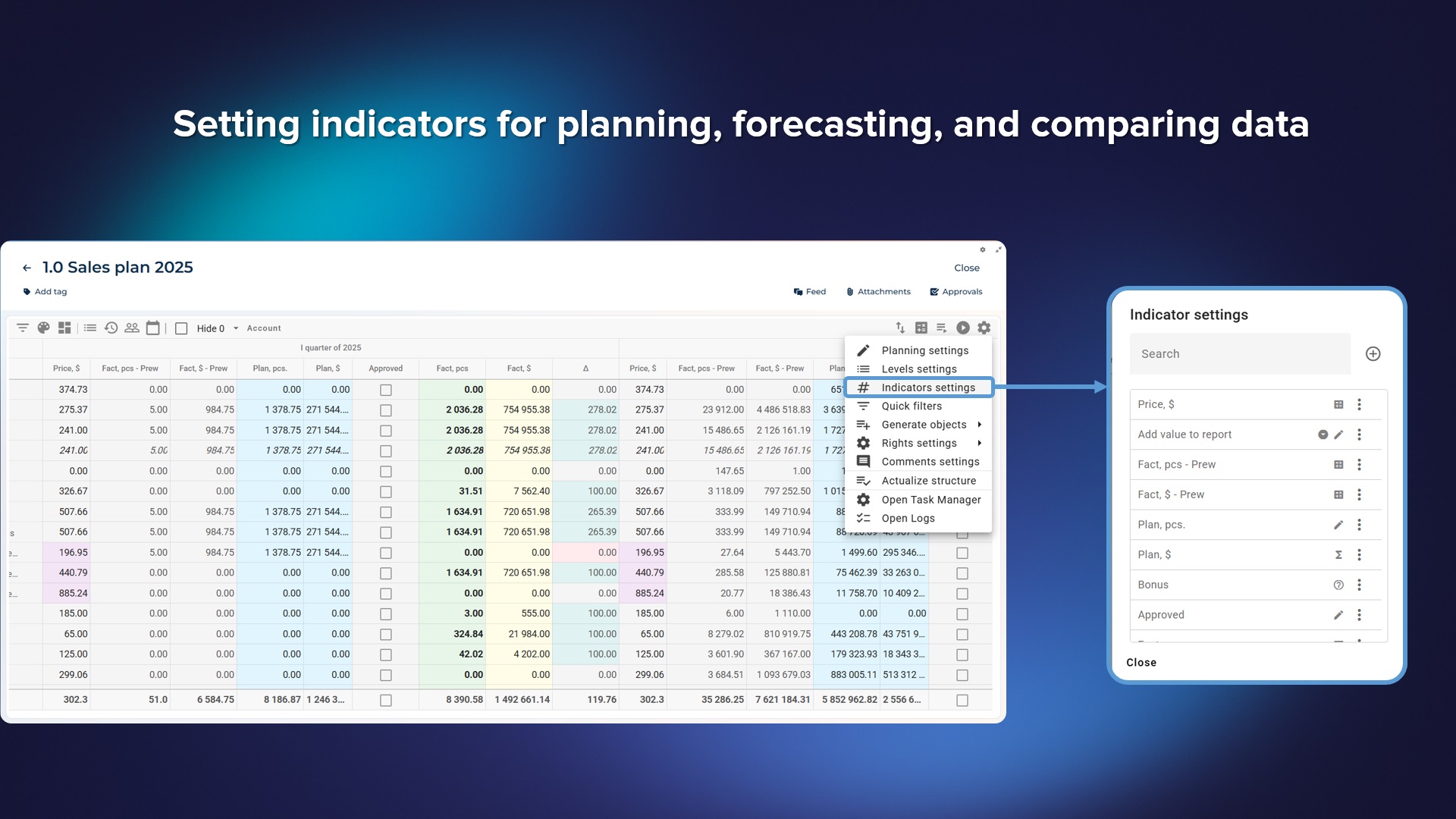 Sales'Up Data Management for Creatio is a multifunctional tool for planning, budgeting, and performance management at all levels of a company. It enables users to work with financial and quantitative targets, compare planned and actual results, build complex models using advanced formulas and logic, and perform real-time calculations on large volumes of data. The solution supports custom reporting periods, flexible formatting, role-based filtering, and user profile customization.