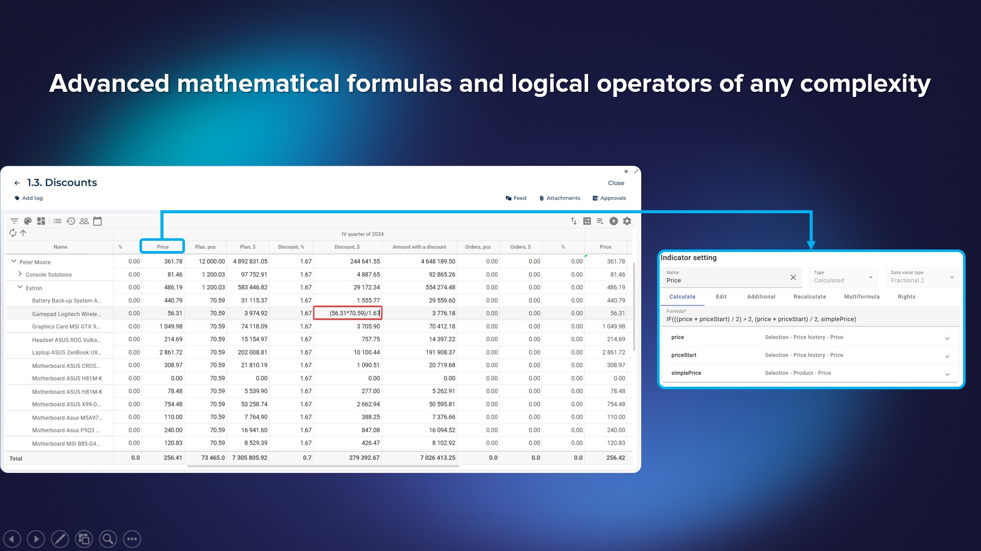 Provides the ability to add several formulas with filtering in one column. Lines that match the formula filters will be calculated using separate formulas (taking into account the priority of the formula), and lines that do not fit the filters will be calculated using the standard formula. Additionally, for a multi-formula, filtering is available to group those records for which the multi-formula should be applied.