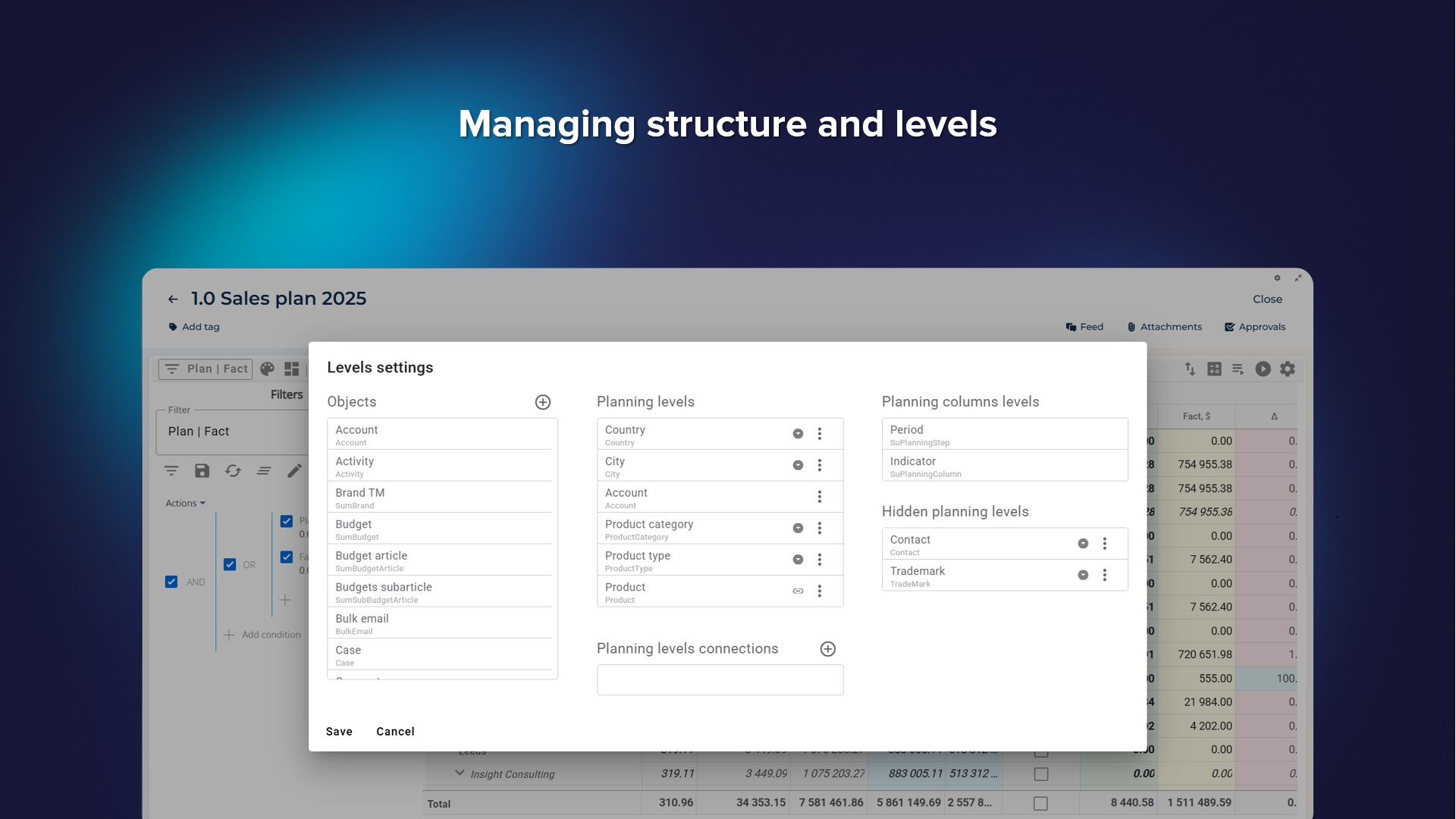 - Strategic planning of medium and large sales departments (with the possibility of planning from the bottom up and vice versa);