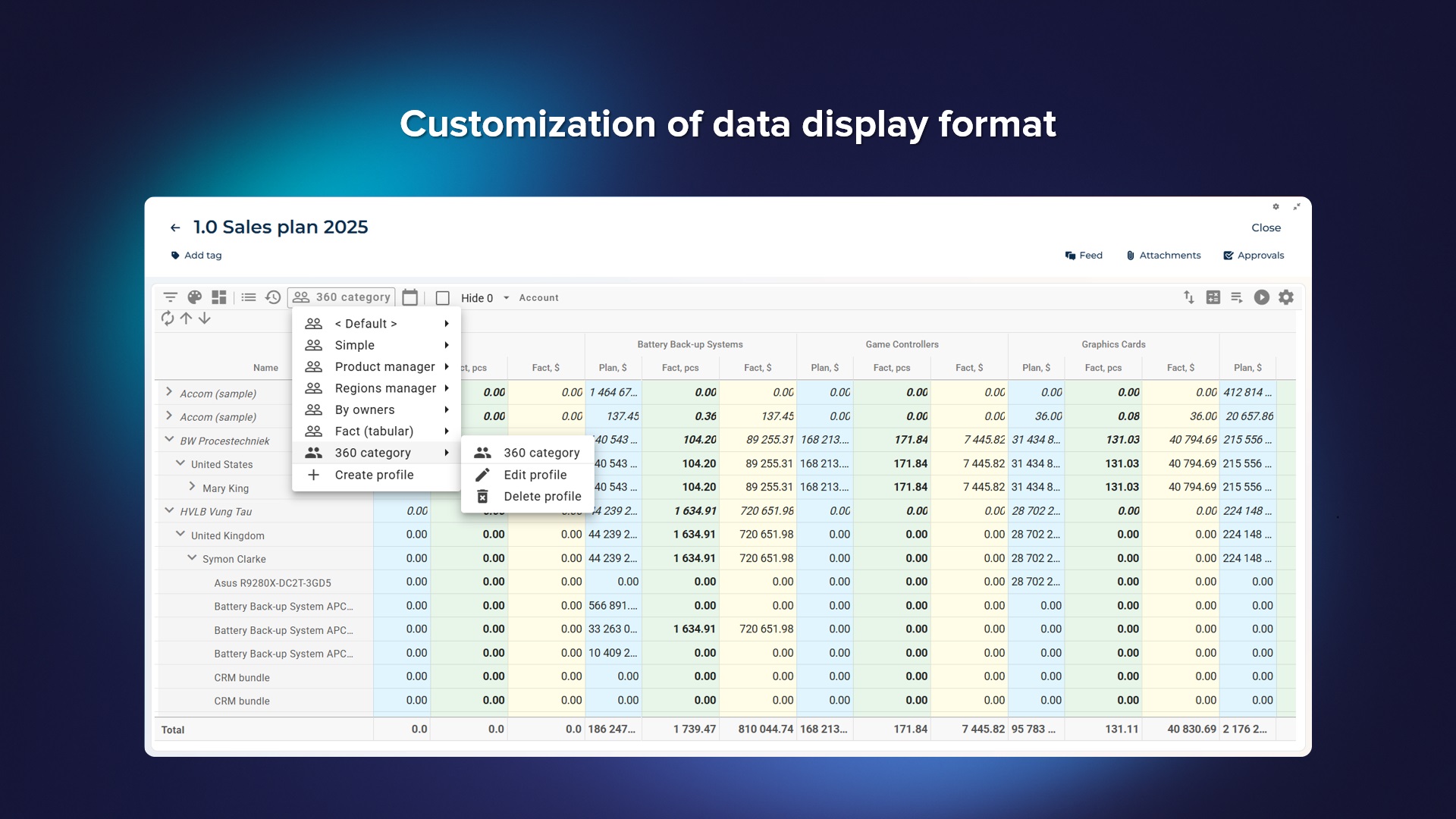 - Comparison of planned and factual values of the company's sales with the possibility of detailing to a business unit or an individual employee;
