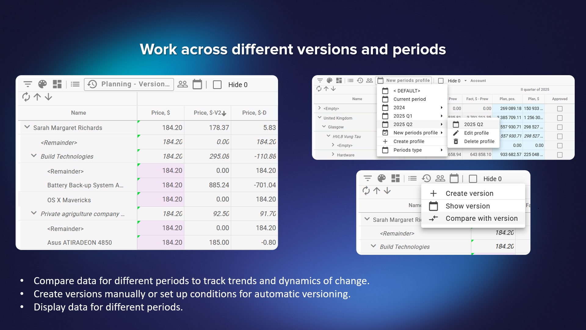 - Maintaining a budget at the level of the entire company with the ability to store and compare versions when relocating or changing the amount of funds;
