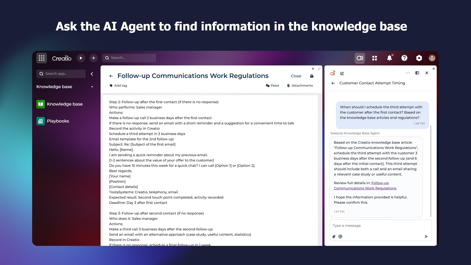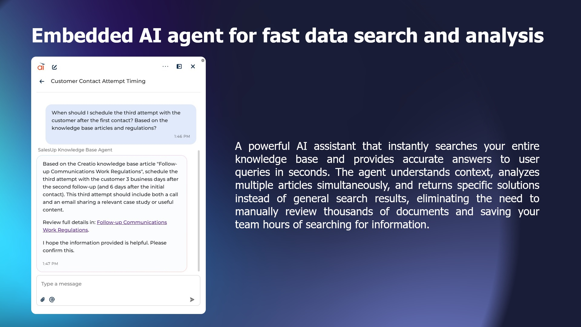 Designed for sales, service, operations, and technical teams, the SalesUp Knowledge Base Agent eliminates manual searches and document navigation. Users can query company policies, validate procedures, check guidelines, retrieve instructions, summarize complex regulations, and even receive recommended next steps, all within the Creatio workspace.