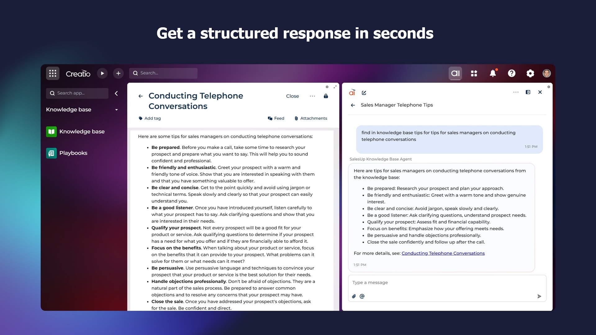 An AI agent for searching and processing information that allows Creatio users to instantly receive accurate answers from all articles in the knowledge base without wasting time manually searching for the right document and information in it.